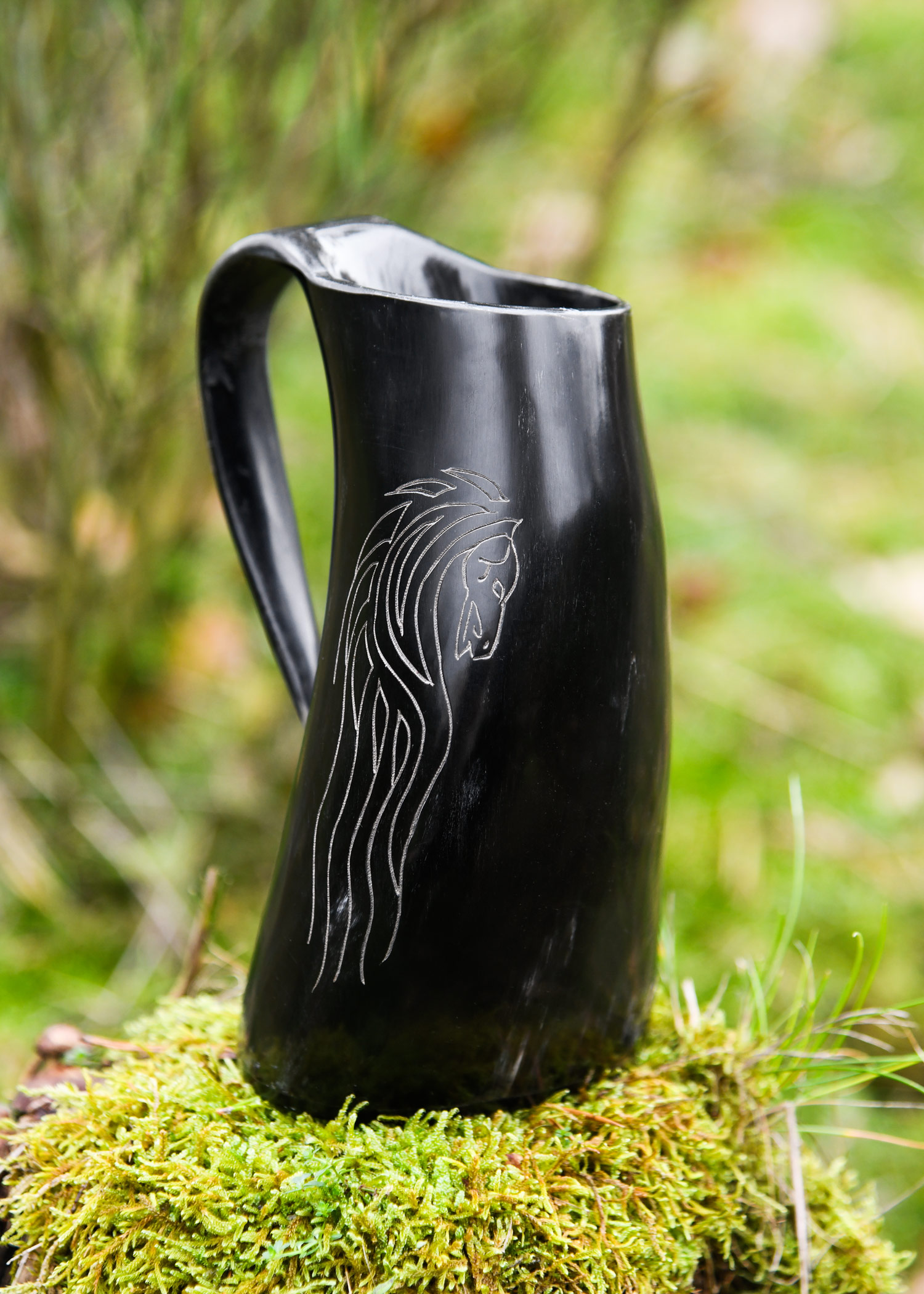 Dieser großzügig bemessene Henkelbecher / Humpen wird aus Rinderhorn in Handarbeit gefertigt, poliert, und mit einem eingravierten Pferdemotiv (Horse Lords) verziert.