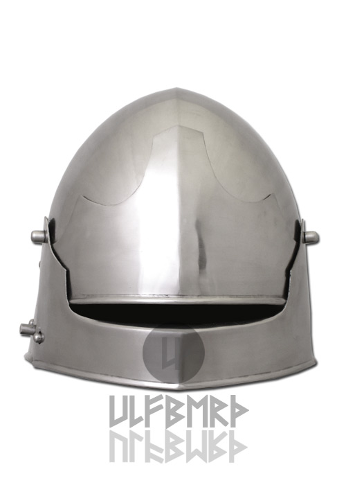 Unsere sehr originalgetreue Rekonstruktion eines deutschen Schallers verbindet sowohl authentische Darstellung als auch größtmögliche Sicherheit beim Schaukampf. Das Original stammt vermutlich aus einer Nürnberger Plattnerei und wird auf ca. 1480 datiert. Das klappbare Visier ist durch ein seitlich angenietetes Schloss in der untersten Stufe arretierbar. Der Helm hat ein sehr komfortables, gepolstertes Stoff-Inlay und einen soliden Kinnriemen mit Messingschnalle. Dieses Helmmodell ist standardmäßig in drei Größen erhältlich (S, M und L). Details für Schaller Gr. L: Kopfumfang: bis ca. 63 cm Langer Innenabstand (Hinterkopf-Stirn): ca. 23,5 cm Kurzer Innenabstand (Ohr-Ohr): ca. 19,5 cm Material: ca. 2 mm Stahl Gepolstertes Stoff-Inlay mit Kinnriemen aus Rindsleder Gewicht: ca. 3,2 kg Dies ist ein Produkt von ULFBERTH®.