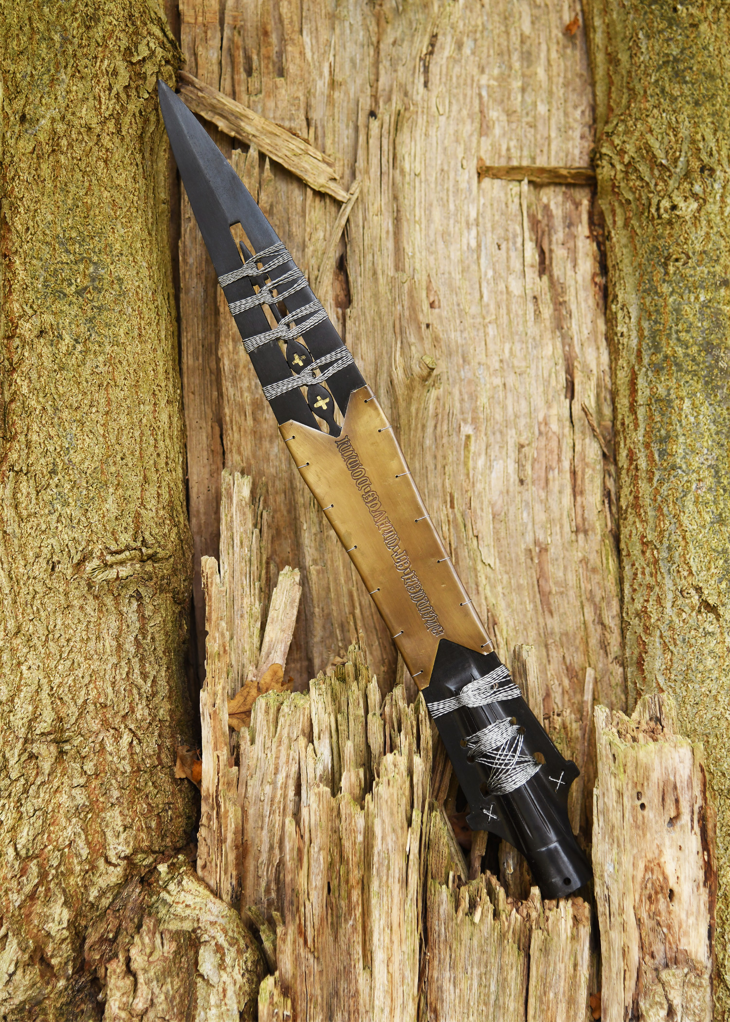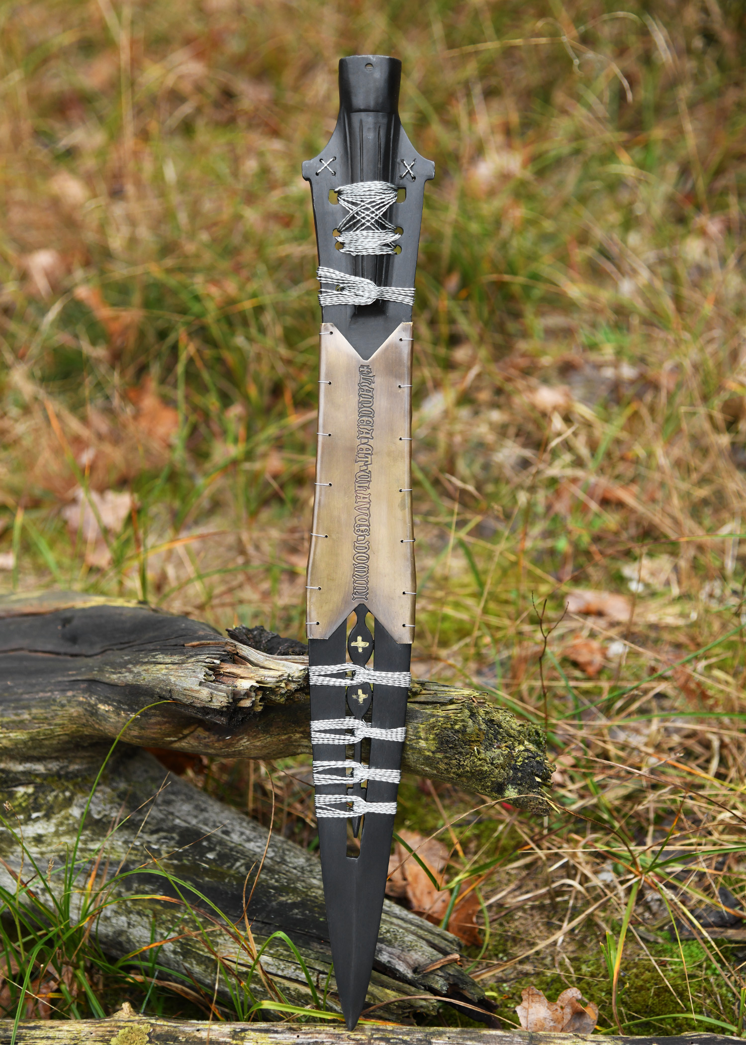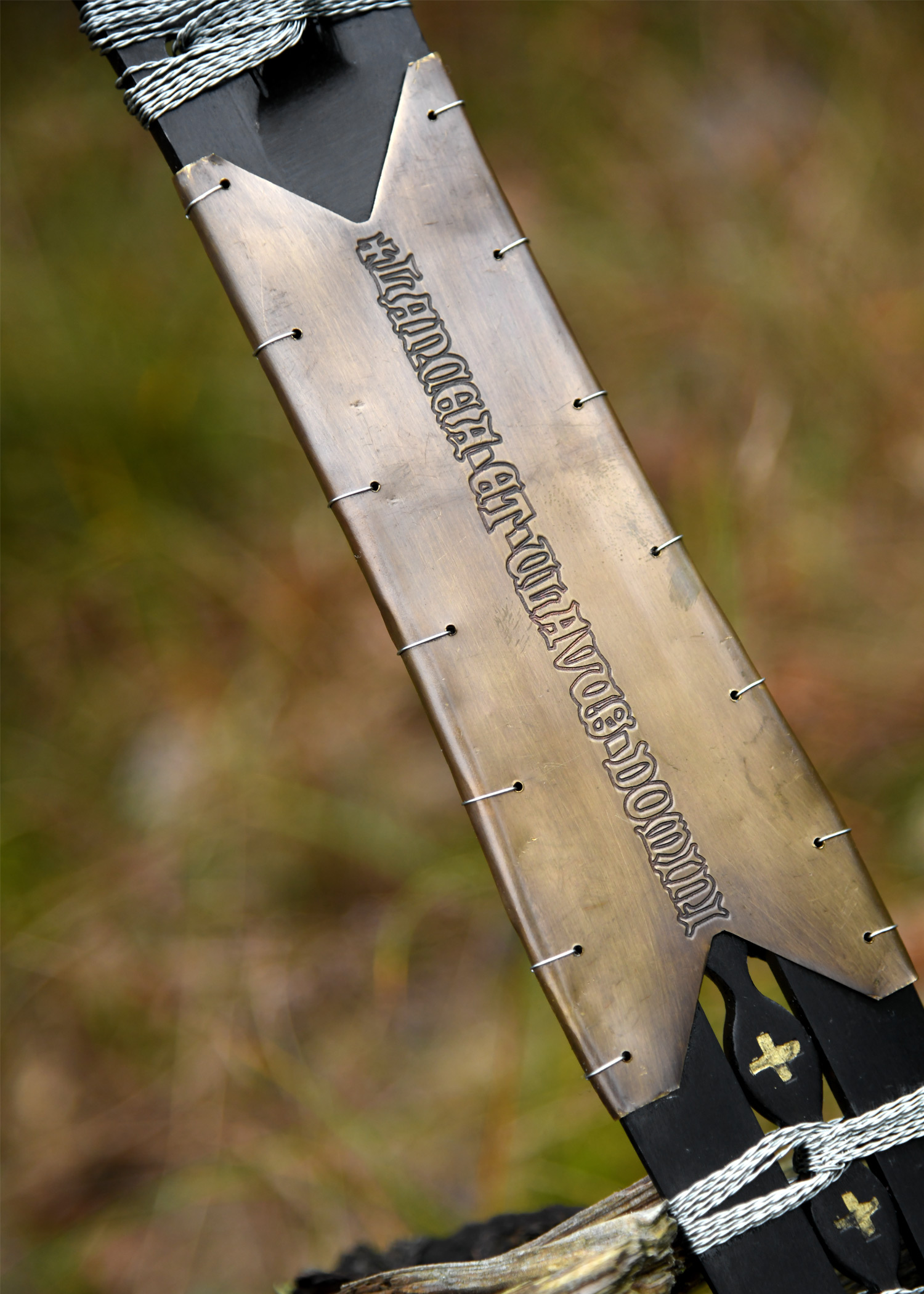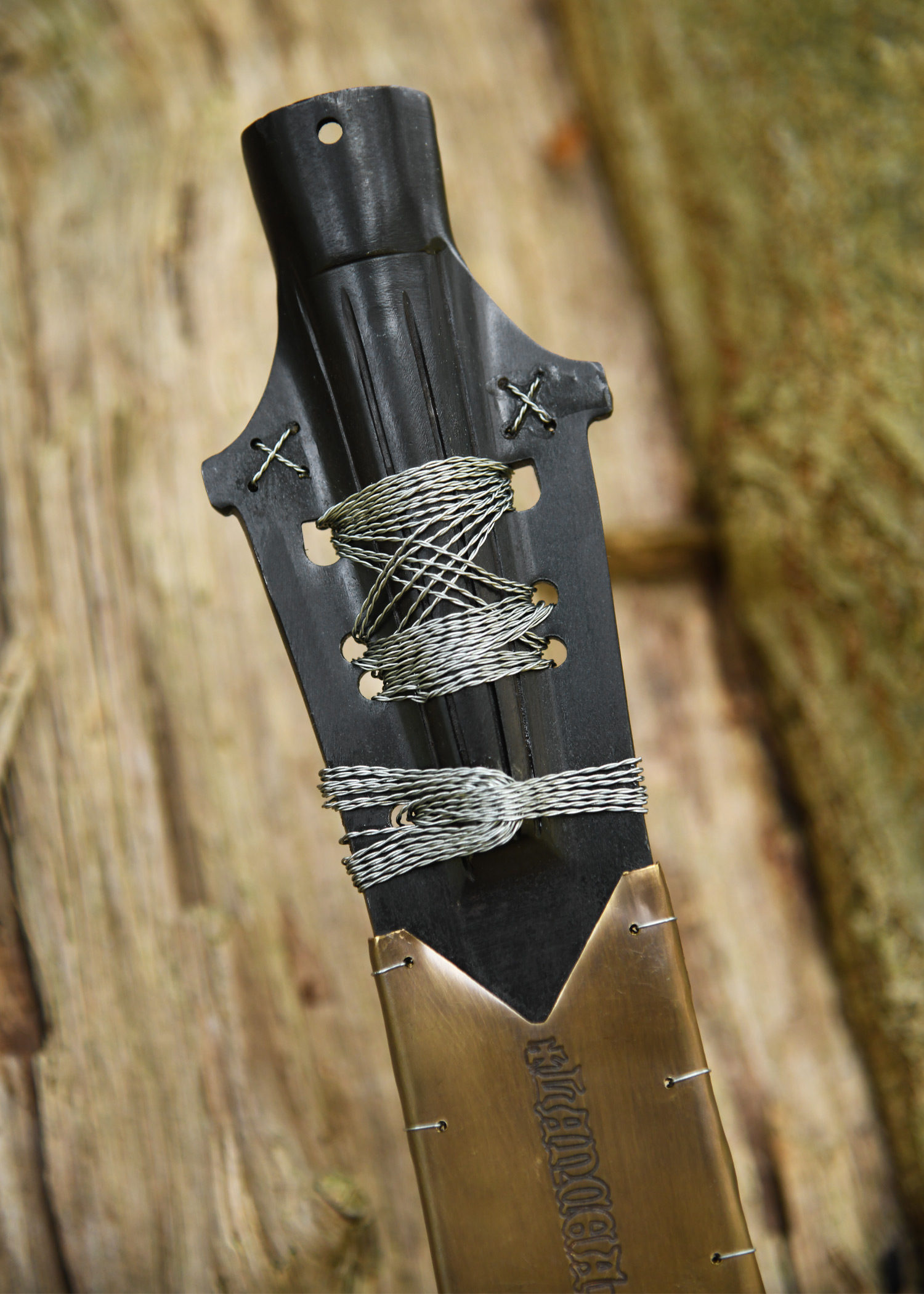Erstklassige und hochwertige Museumsreplik der Heiligen Lanze , heute zu finden in der Schatzkammer in Wien. Es handelt sich um eine Flügellanzenspitze, die kunstvoll durchbrochen und abschnittsweise aufwendig mit Silberdraht umwickelt und mit Messingblech eingefast ist. Auf dem Messingblech findet sich die lateinische Inschrift: LANCEA ET CLAVUS DOMINI, was übersetzt soviel wie Die Lanze und der Nagel des Herrn bedeutet.