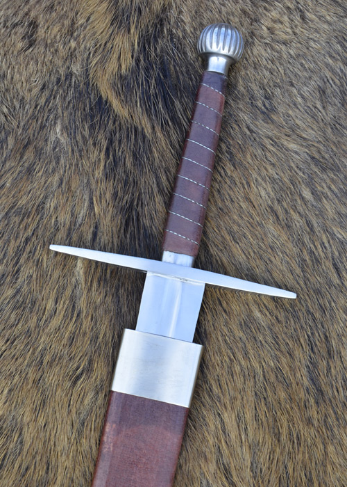 Diese Nachbildung eines spätmittelalterlichen Zweihandschwertes ist ausschließlich in Handarbeit gefertigt. Die Klinge geht bis zum Knauf durch und ist dort verschraubt. Der Griff ist mit Lederband und Draht umwickelt. Die Klinge verfügt über eine ausgeprägte Hohlkehle, welche dem Schwert große Elastizität und zugleich Leichtigkeit verleiht. Die Klingenschneide ist nicht geschärft. Das Schwert kommt mit einer lederbezogenen Holzscheide, die mit einfachen Mund- und Ortblechen versehen ist. Dies ist die reguläre Ausführung des Langen Schwertes. Details: - Klingenmaterial: Federstahl EN45 - Gesamtlänge: ca. 118,5 cm - Klingenlänge: ca. 92,5 cm - Klingenbreite am Parier: ca. 57 mm - Schwerpunkt: ca. 15 cm vor dem Parier - Inklusive Scheide aus Holz und Leder - Reguläre-Ausführung, ebenfalls erhältlich ist die schaukampftaugliche Version - Gewicht ohne Scheide: ca. 1700 g Bitte beachten Sie! Die Abgabe an Jugendliche unter 18 Jahre ist nicht zulässig. Bitte geben Sie deshalb Ihr Geburtsdatum in unserem Bestellformular an. Zusätzlich benötigen wir eine Kopie Ihres Personalausweises per E-Mail, Scan, Fax oder Post.