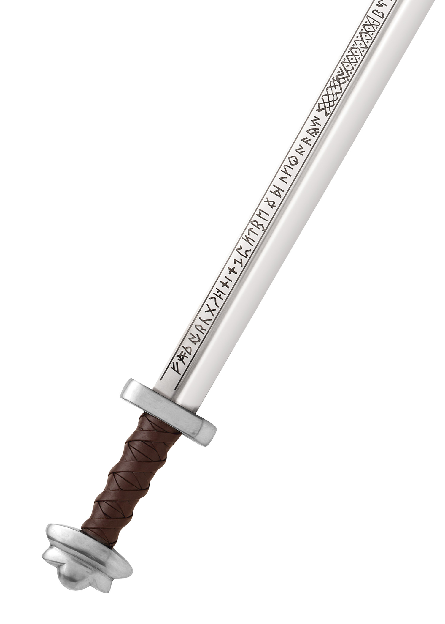 Nach einer Vorlage aus dem Britischen Museum. Seine Klinge ist mit Buchstaben des Runenalphabets verziert. Die Wikinger glaubten, dass Runen magische Kräfte besäßen, und ritzten sie oft in die Klingen ein, um ihre Stärke zu steigern. Der lederumwickelte Griff sorgt für einen sicheren Halt dieser überraschend leichten und schnellen . Das wird mit einer braunen Lederscheide und zwei Riemen zum Aufhängen am Gürtel geliefert. Es wird werkseitig scharf geliefert.