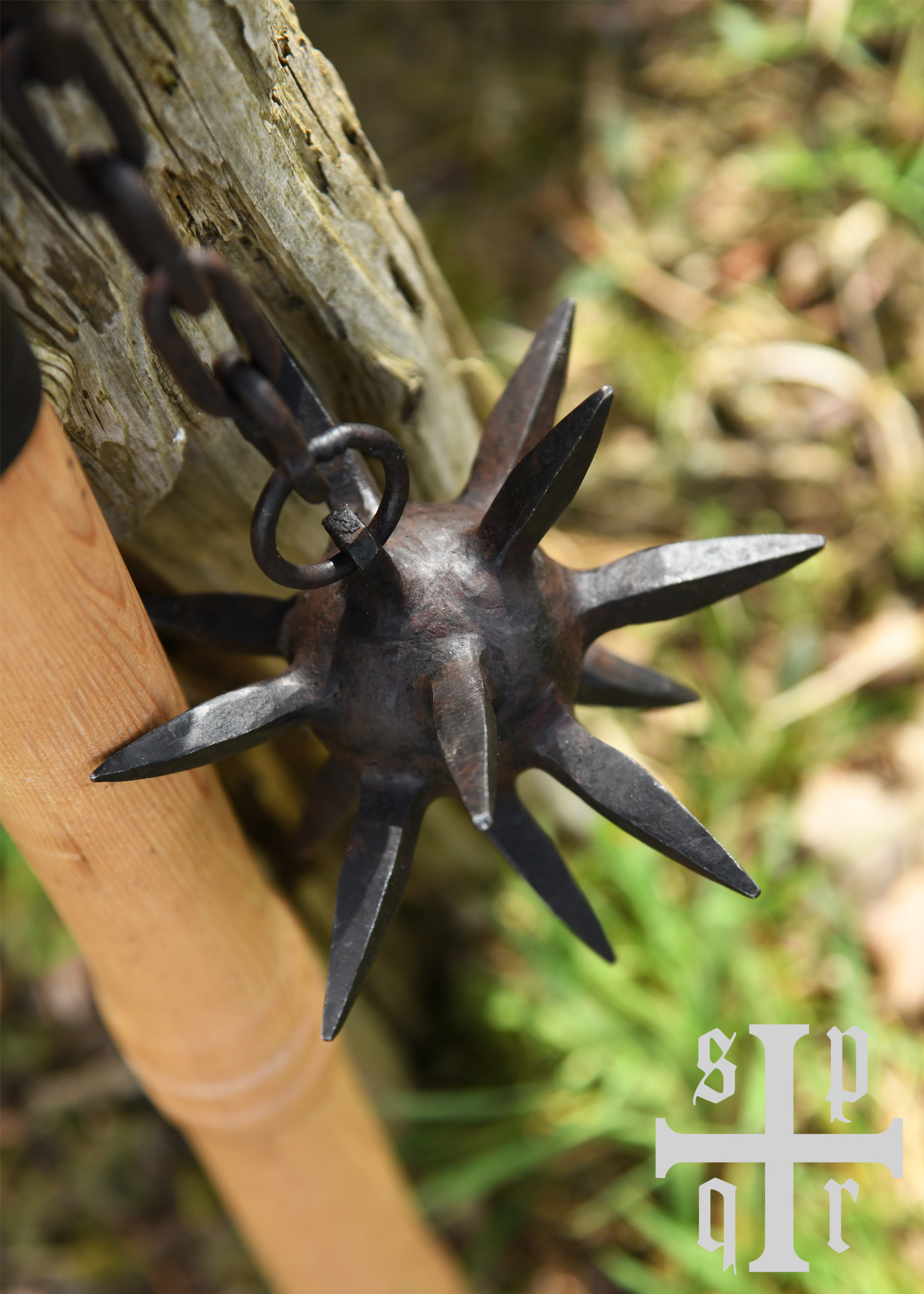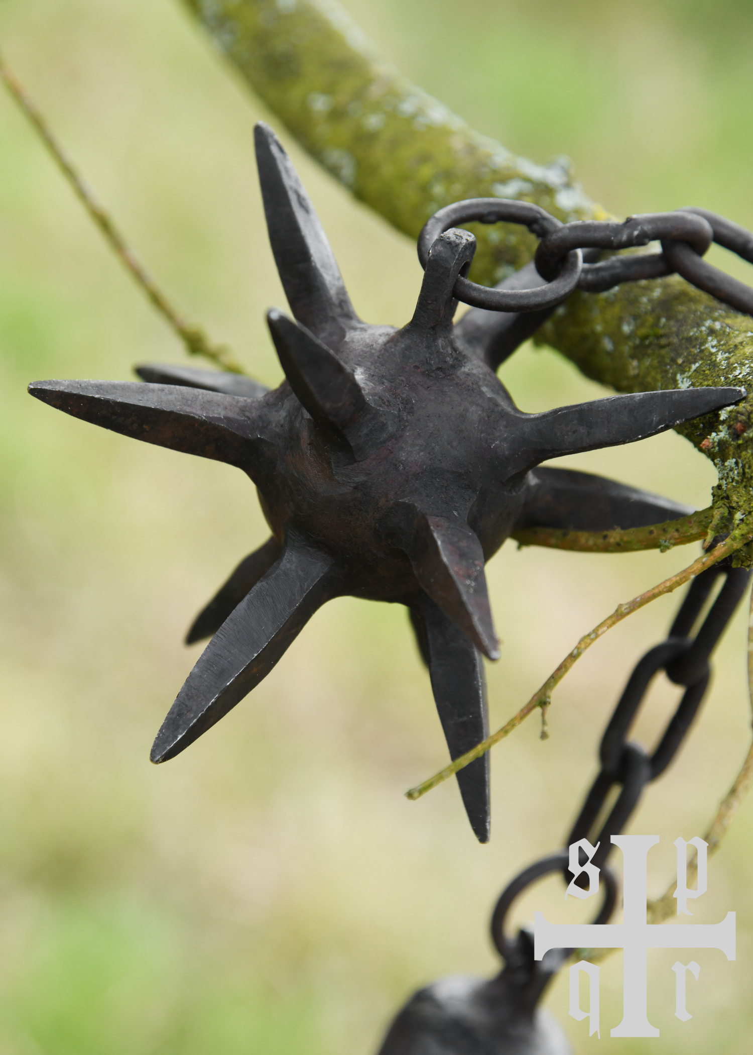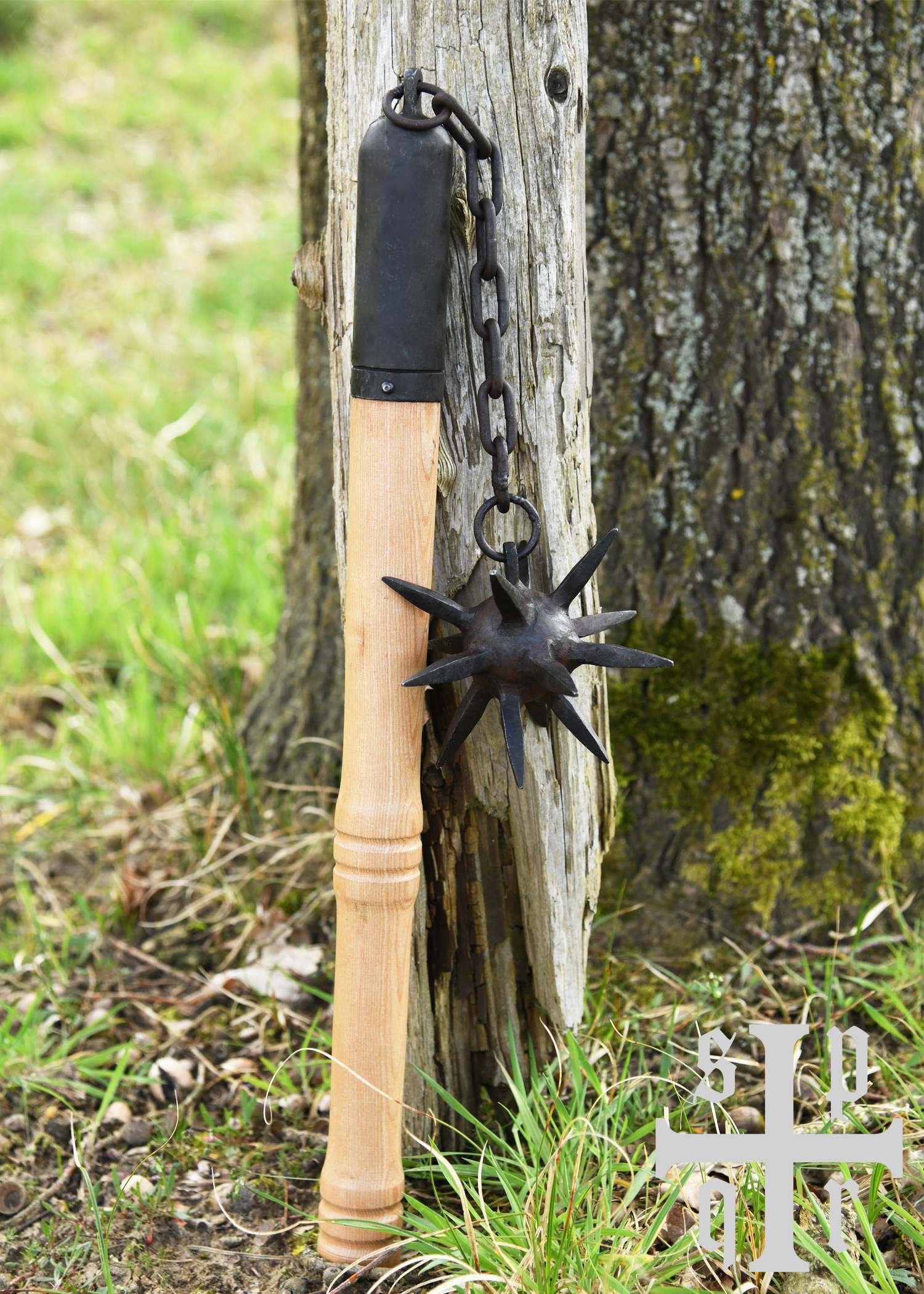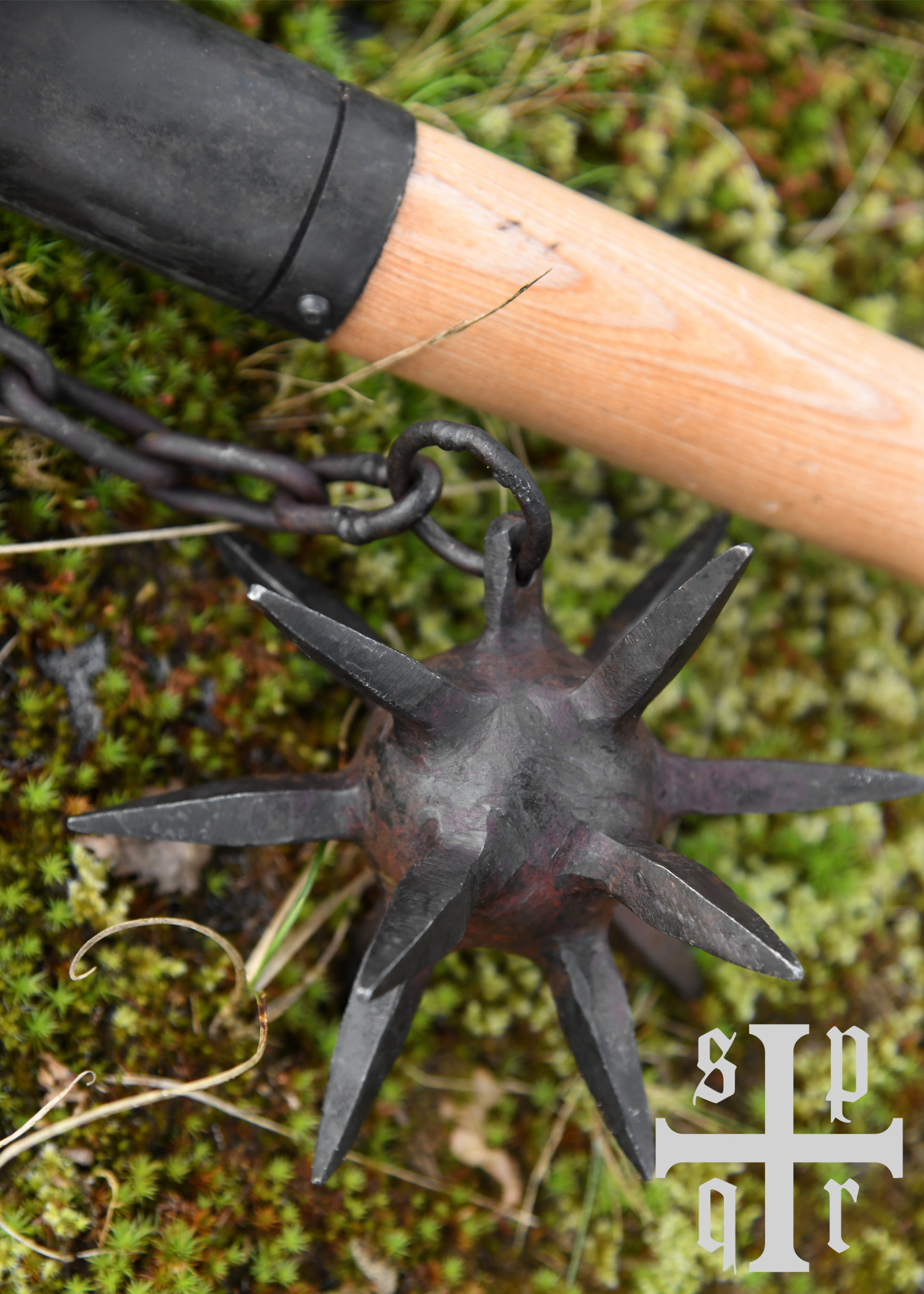 Die hier angebotene Rekonstruktion besteht aus einem ca. 52 cm langen Griffstück aus Eschenholz, an dessen Ende – welches mit einer Metallhülse versehen ist – eine Metallkette befestigt ist. An dieser Kette hängt eine schwere, sternförmige Kugel aus Karbonstahl. Die Oberfläche der Stahlkugel, der Kette und der Hülse wurde bewusst unbehandelt belassen, besitzt also noch eine schmiedeschwarze Zunderschicht, die der Waffe einen rustikalen, authentischen Charakter verleiht.