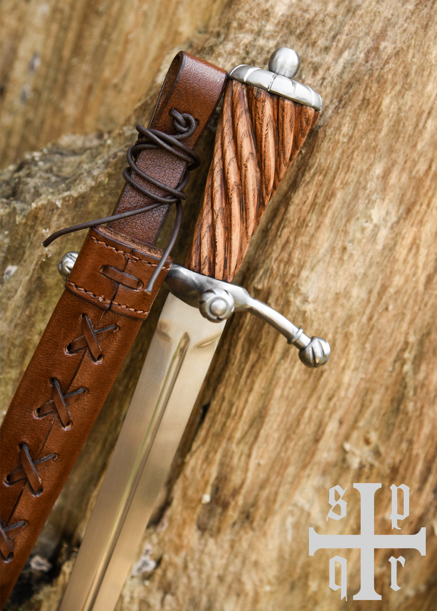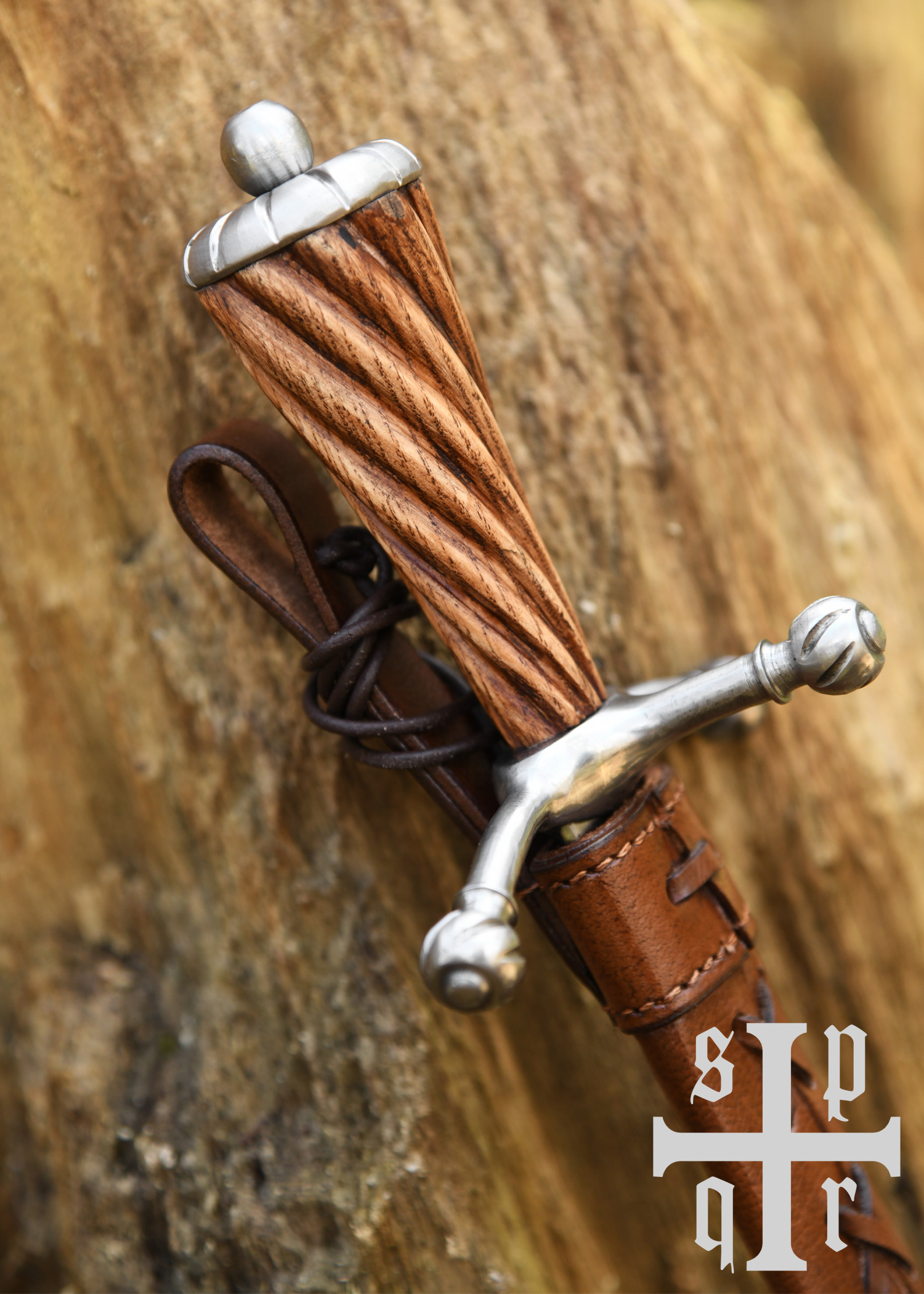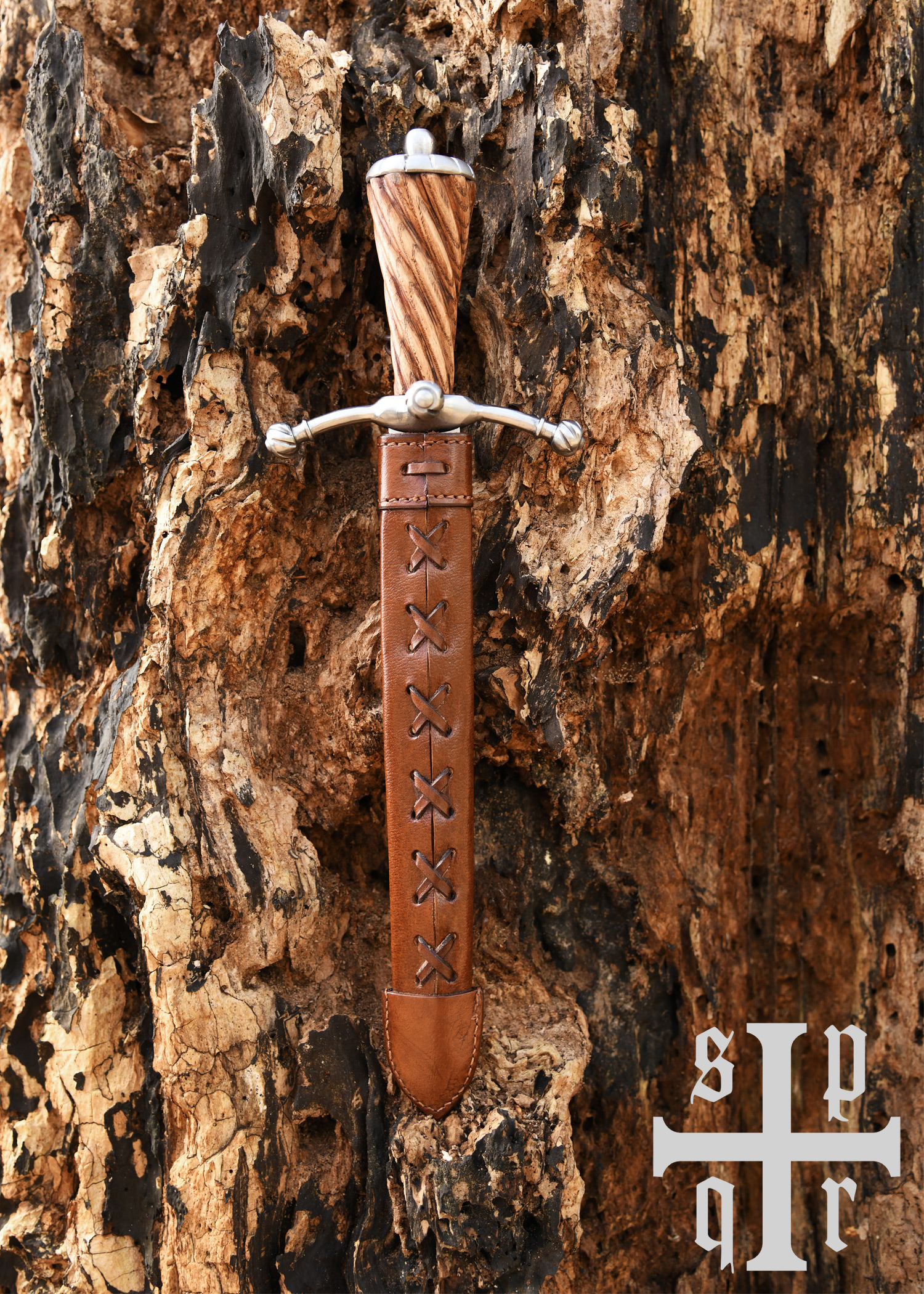 Dieser wunderschöne spätmittelalterliche Dolch besitzt eine gehärtete, auf ca. 48-50 HRC angelassene Federstahlklinge mit durchgehender Angel. Die Hohlkehle verläuft beidseitig über etwa zwei Drittel der Klingenlänge. Der leicht nach vorne gerichtete Handschutz aus Stahl besteht aus drei Armen mit kugelförmigen, gerillten Enden, und der elegante Holzgriff schließt mit einem ebenso stilvollen Stahlknauf ab. Die schöne Scheide aus vegetabil gegerbtem Leder ist mit einer Gürtelschlaufe ausgestattet.