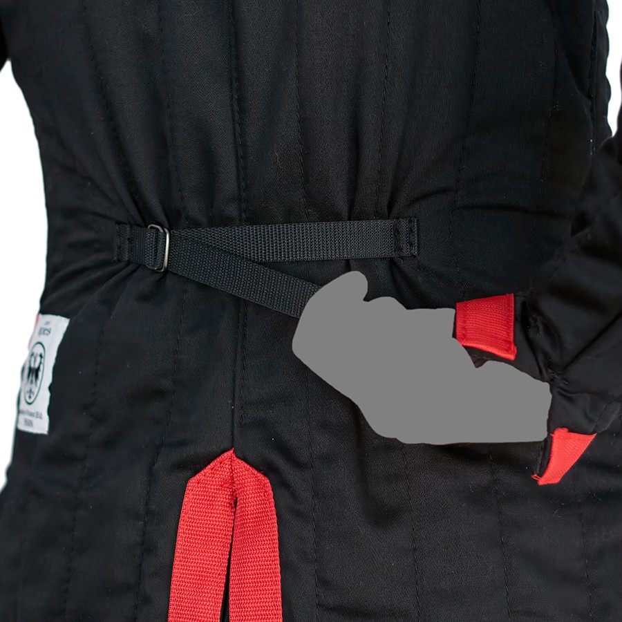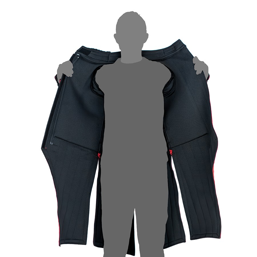 Die lang geschnittene Jacke, die bis knapp unter das Knie reicht, wird mit einem Klettverschluss und einem Reißverschluss geschlossen. Sie verfügt über einen Klingenfänger am Kragen und rote Besätze an der Unterseite, den Ärmeln und der Frontklappe. Die Jacke hat Schlitze am Boden, vorne, hinten und an den Seiten. Mit verstellbaren Taillengurten auf dem Rücken und Ellbogenbefestigungen für zusätzliche Overlays wie Shell oder PRO kombiniert die Jacke Funktionalität mit einem einzigartigen Aussehen.
