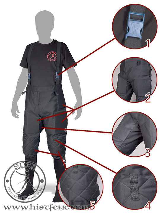 Speziell für HEMA entwickelte HEMA-Hose von SPES. Länge bis kapp unters Knie, mit elastischen Bünden am Ende. Die Hose ist im Hüftbereich extra hoch gezogen und wird durch verstellbare Hosenträger mit Kunststoffschnallen gehalten. Die Hose besitzt innen gelegene Taschen in denen die extra Polsterung befestigt wird. Zum Waschen können diese entfernt werden. An der Rückseite befinden sich zwei verschließbare Taschen. An den extra gepolsterten Knien befinden sich Befestigungspunkte zur Befestigung weiteren Protektoren (Beinschutz).Material: Außenseite: 50% Baumwolle, 50% Polyester; Futter: 100% Polyester