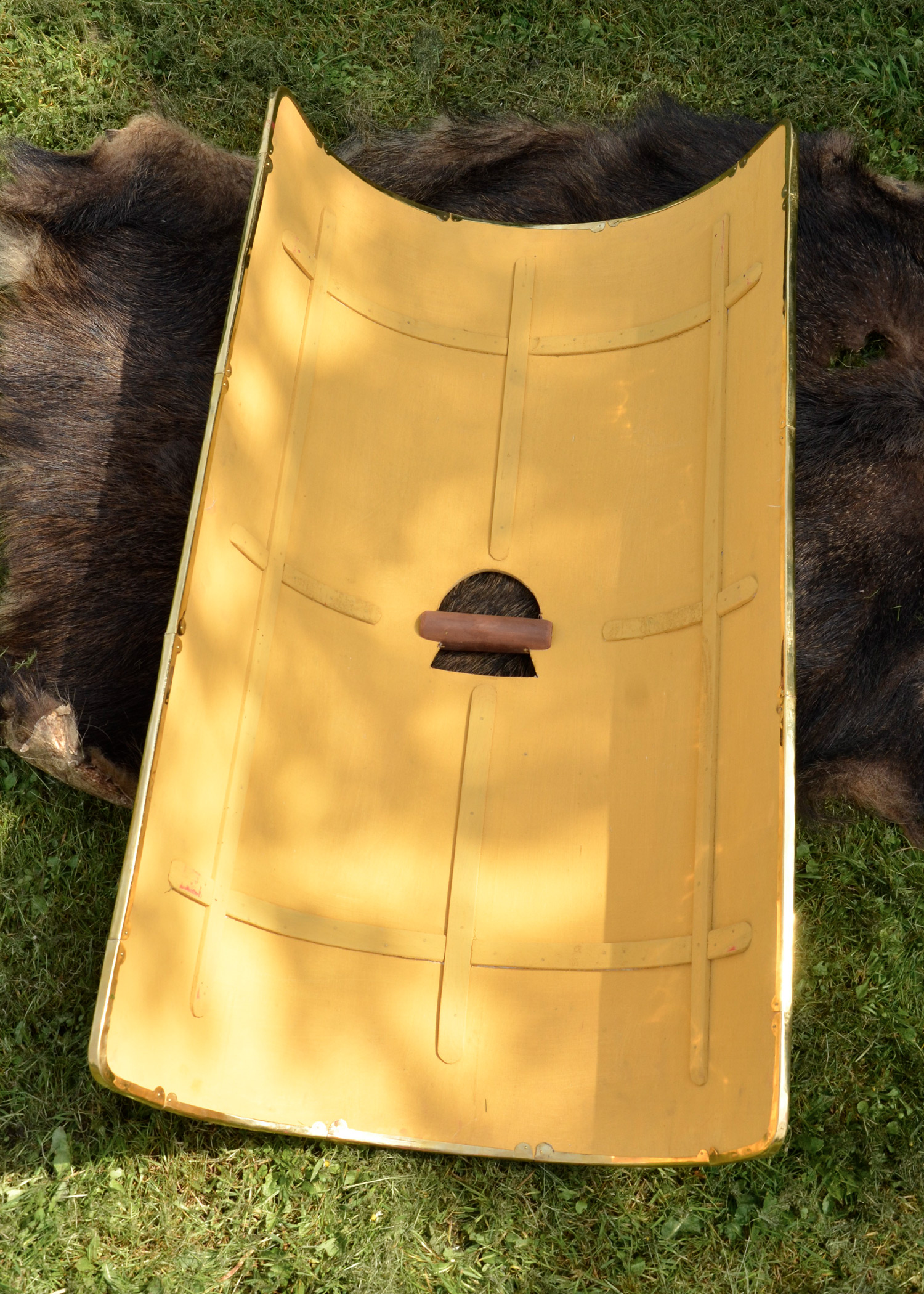 Der ist aus Holz gefertigt und hat einen handbemalten Leinenüberzug auf der Vorderseite. Die Rückseite ist mit dünnen Holzleisten verstärkt. Getragen wird der Schild normalerweise durch einen Eingriff im oder Umbo.