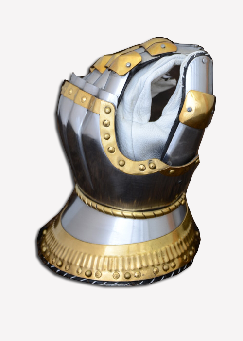 Unsere schaukampftaugliche Rekonstruktion spätmittelalterlichen Stundenglashandschuhe sind in sehr kunstvoller Handarbeit hergestellt. Ähnliche Handschuhe sind im Original im Schloss Churburg, Südtirol zu besichtigen und wurden vermutlich gegen 1390 von einem mailändischen Rüstungsschmied gefertigt. Sie zeichnen sich nicht nur durch die akkurate Verarbeitung und das authentische Aussehen aus, sondern bestechen auch durch ihren sehr guten Tragekomfort, denn alle Fingerglieder sind frei beweglich und innenseitig ist komplett ein weicher Lederhandschuh eingenäht. Die Panzerhandschuhe sind für den Schaukampf geeignet. Sie sind aus ca. 1,6 mm starkem Stahl gefertigt. Zudem sind die Stahlteile mit Messingblech kunstvoll verziert und verstärkt. Die Innenhandschuhe sind aus hellem Leder, eine Verschmutzung durch die leicht eingeölten Stahlteile ist daher unter Umständen möglich. Alles in allem, eine nahezu perfekte Nachbildung der spätmittelalterlichen Plattnerskunst. Details: - Material: 1,6 mm Stahl, Messing und Leder - Größe: Einheitsgröße bis ca. Gr. 9 - Gewicht: ca. 1,6 kg (Paar) Sicherheitshinweis: