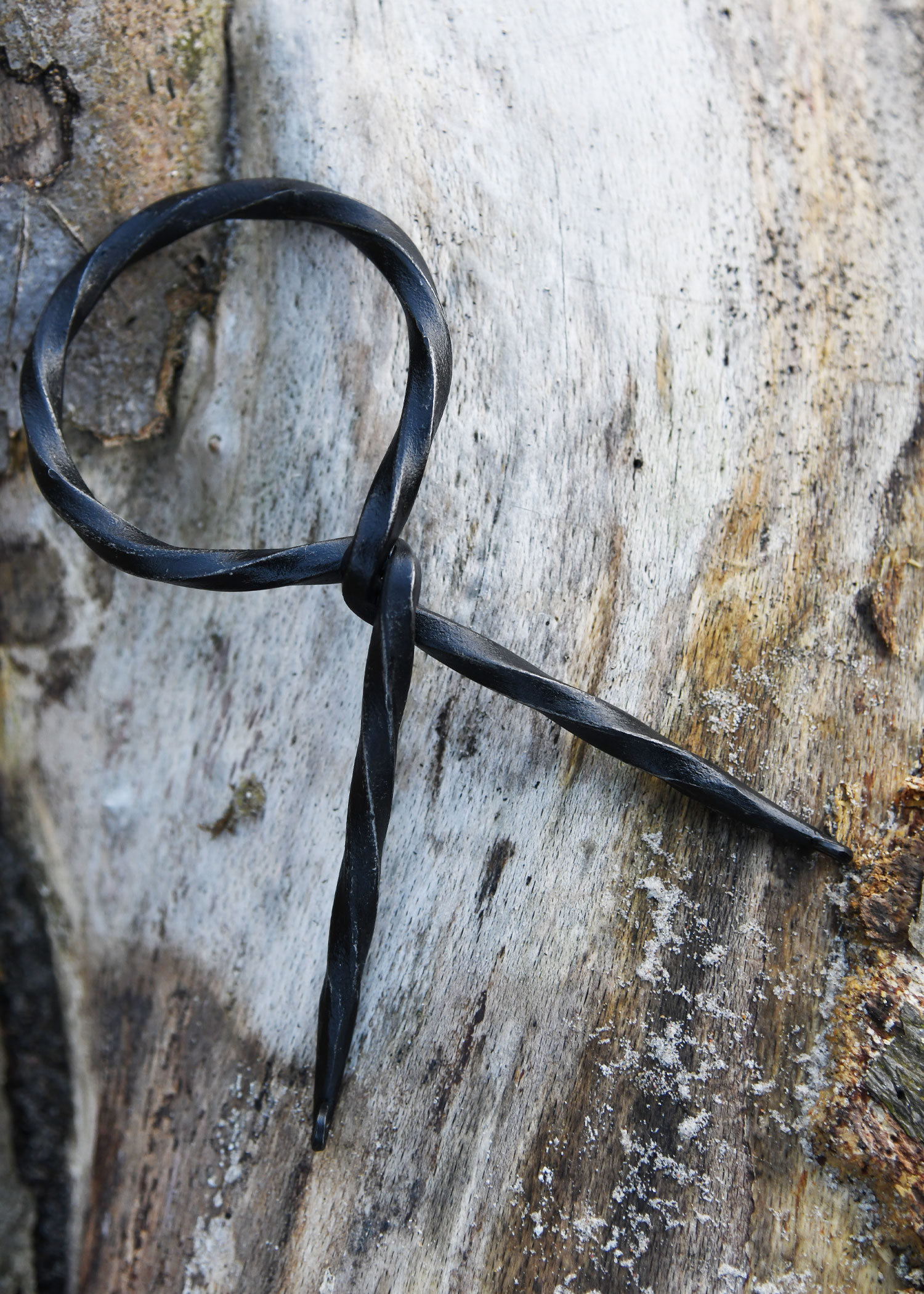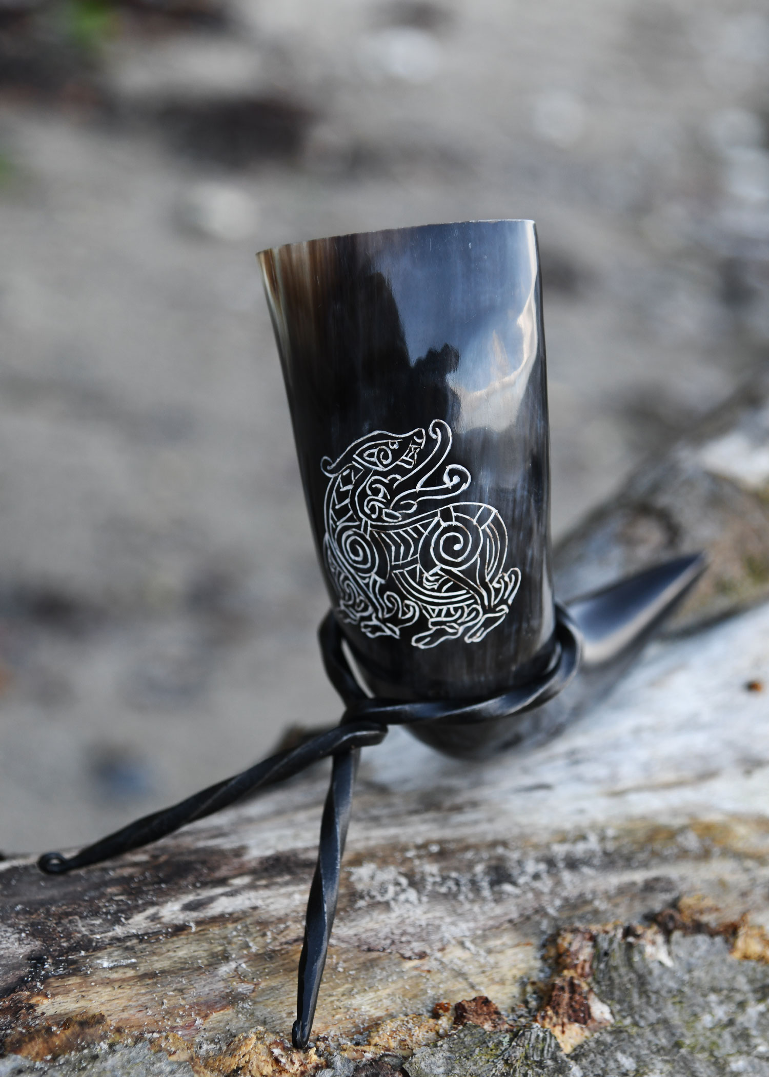 Zum Lieferumfang gehört ein praktischer, gut transportabler Trinkhornständer aus handgeschmiedetem Stahl mit einfachem Prinzip: Steckt man das Horn durch die Öffnung, bilden die Beine des Ständers und die Hornspitze ein standsicheres Dreibein. So kannst Du Dein Trinkhorn immer sicher abstellen.