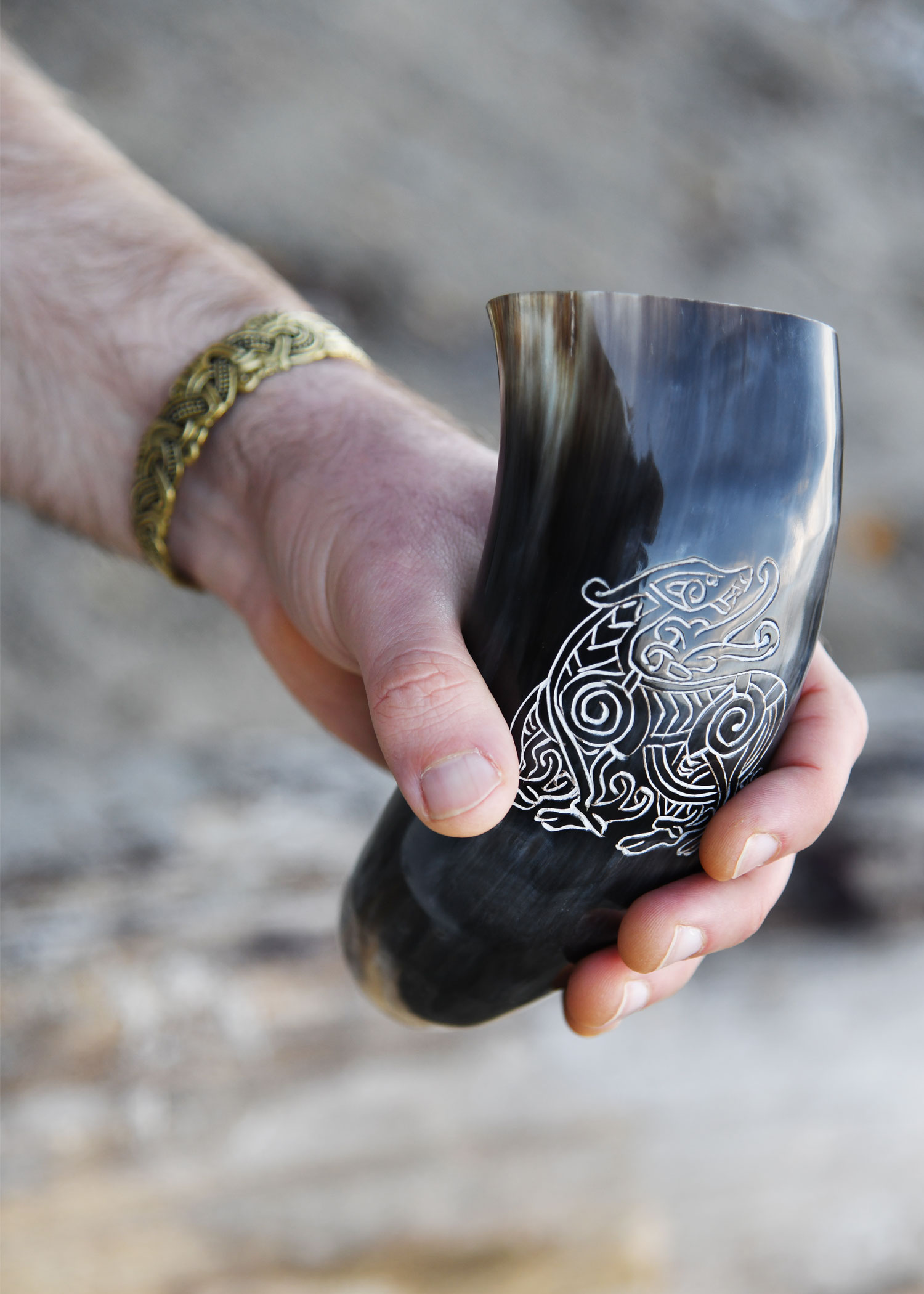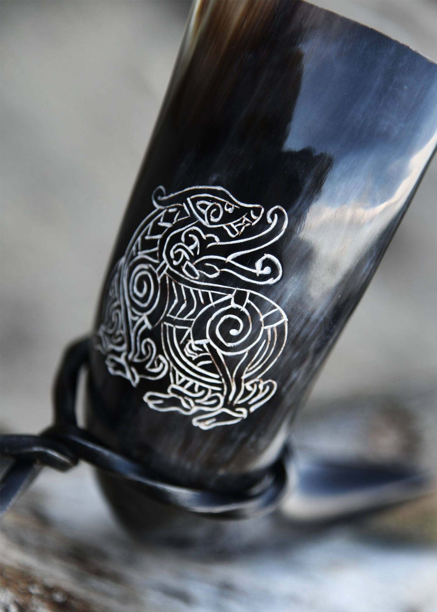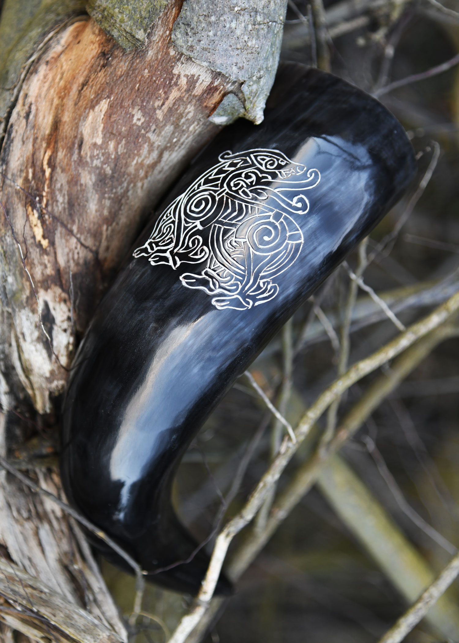 Das hier angebotene Trinkhorn ist aus Rinderhorn in Handarbeit gefertigt, poliert, und mit einem eingravierten Drachen, einem beliebten Motiv der Wikingerkunst, verziert.