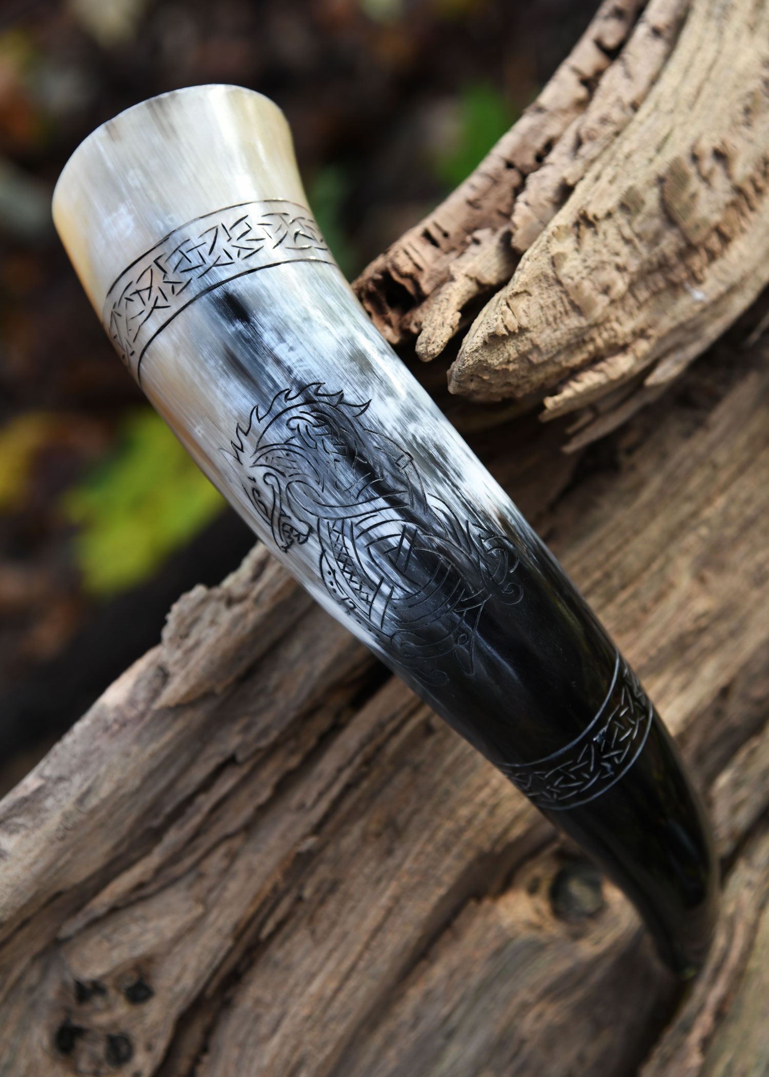 Das hier angebotene Trinkhorn ist aus Rinderhorn in Handarbeit gefertigt, poliert, und mit einem eingravierten Motiv vom Fenriswolf (auch Fenrir, Fenris oder Fenrisúlfr) verziert. In der germanischen Mythologie gehört Fenrir, Sohn des böslistigen Gottes Loki und der Riesin Angrboda, zu den Weltfeinden. Er bekämpft die bestehende Ordnung und verkörpert letztlich die Vernichtung der Welt. Die Götter erkennen seine Gefährlichkeit, ketten ihn mit einer List an einen Felsen und versenken ihn tief im Grund der Erde. Für lange Zeit ist der Wolf gebändigt, bis er schließlich, in der Zeit der Götterdämmerung, seine Ketten sprengt und Odin verschlingt. Odins Sohn Widar tötet Fenrir, aber es ist zu spät, der Göttervater fällt und mit ihm die Ordnung der Welt.