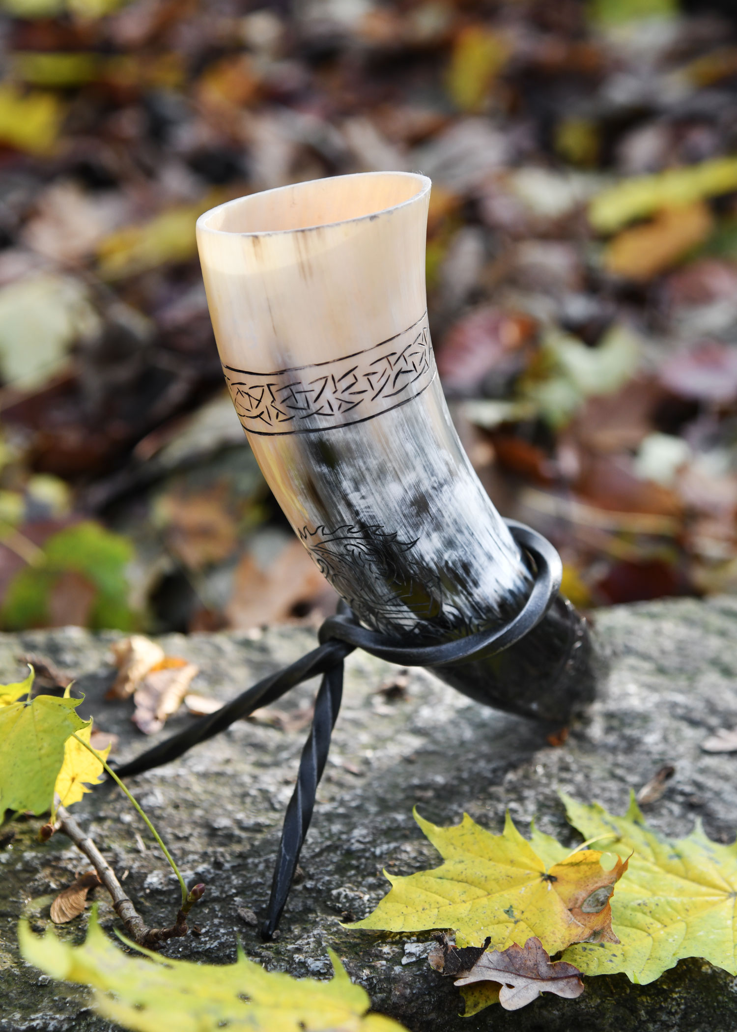 Zum Lieferumfang gehört ein praktischer, gut transportabler Trinkhornständer aus handgeschmiedetem Stahl mit einfachem Prinzip: Steckt man das Horn durch die Öffnung, bilden die Beine des Ständers und die Hornspitze ein standsicheres Dreibein. So kannst Du Dein Trinkhorn immer sicher abstellen.
