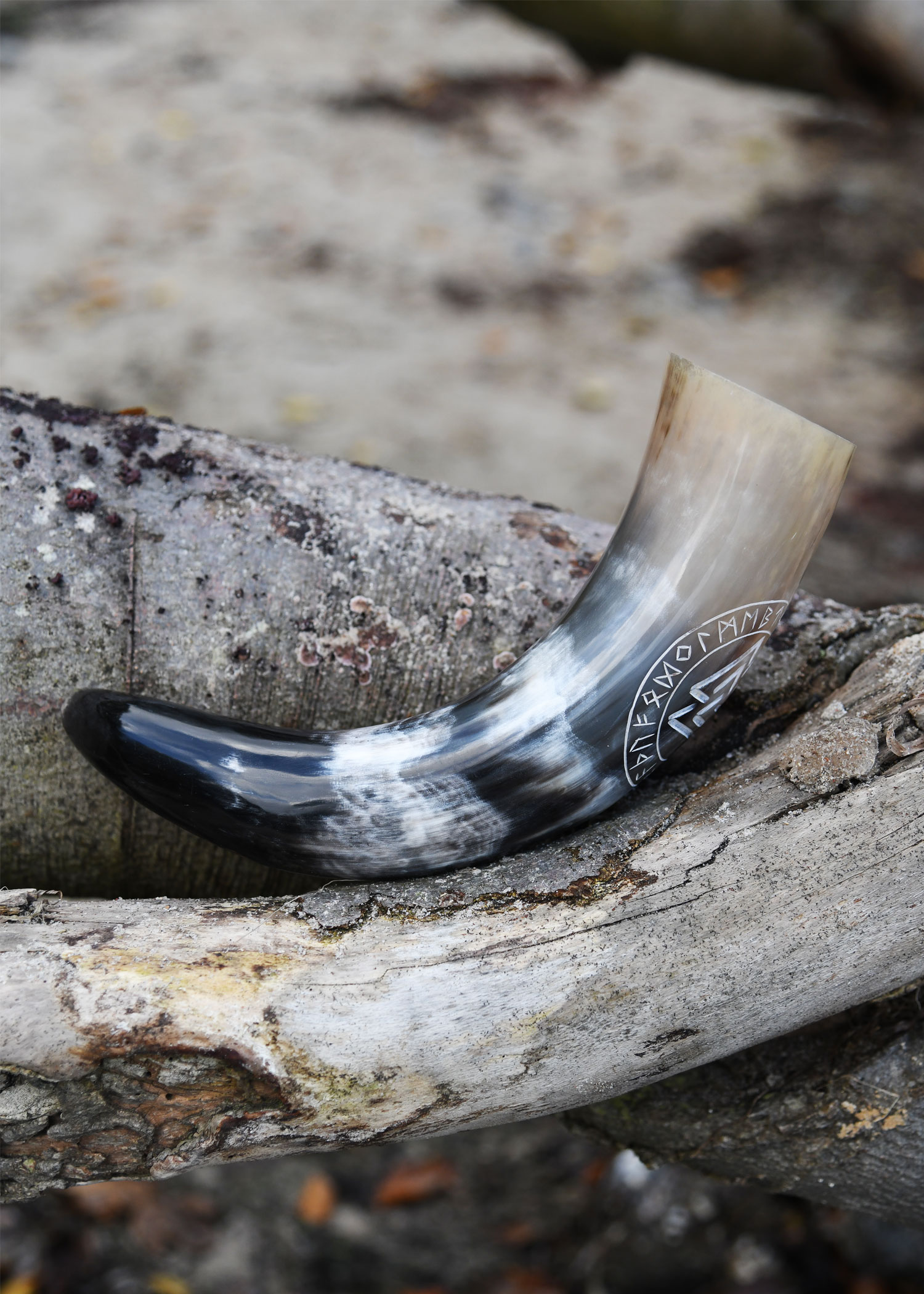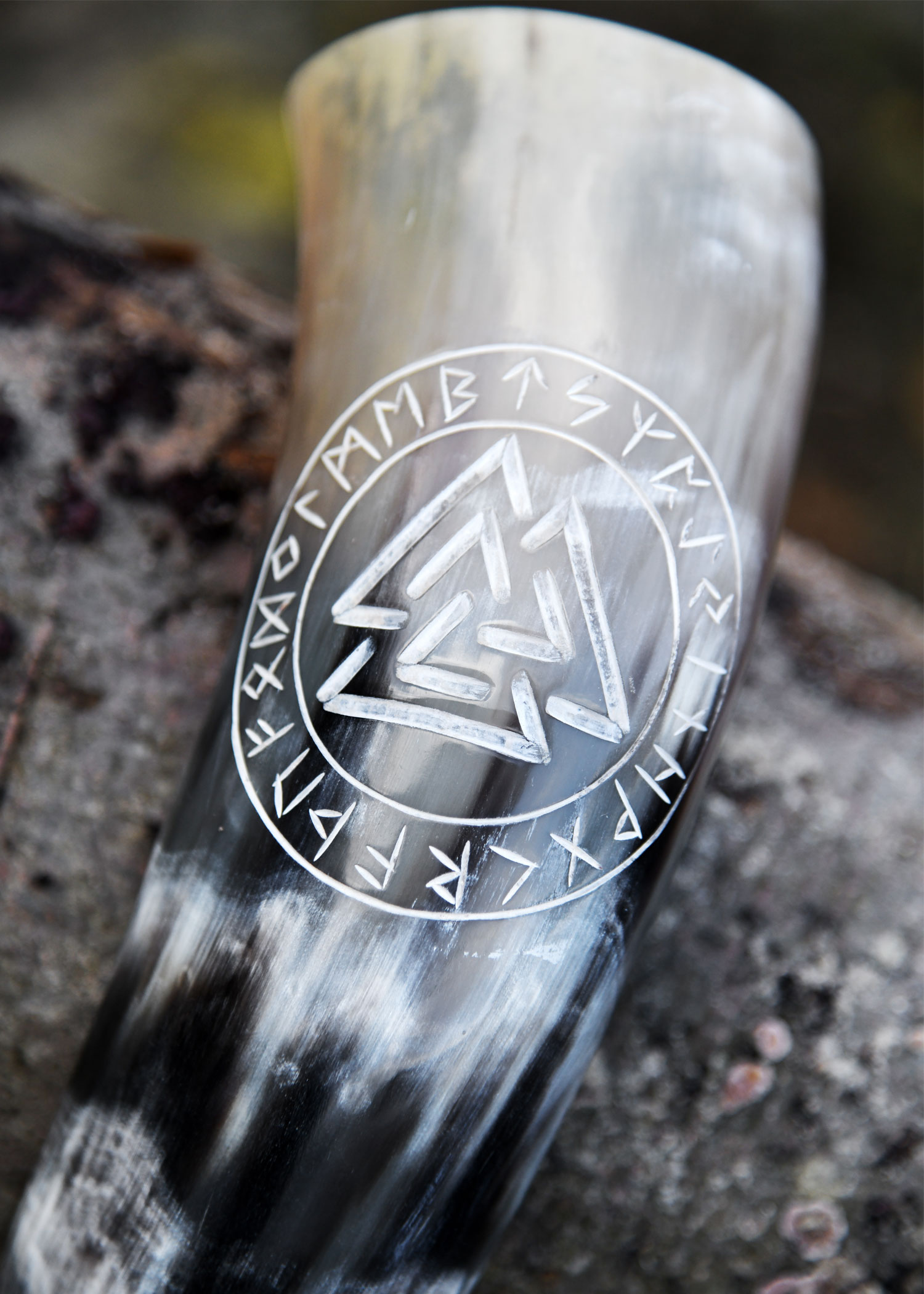 Das hier angebotene Trinkhorn ist aus Rinderhorn in Handarbeit gefertigt, poliert, und verziert mit einem eingravierten Valknut-Symbol umrandet von einer Runenfolge. Die Valknut, ein aus drei ineinandergreifenden Dreiecken bestehendes Symbol, erscheint auf einer Vielzahl von archäologischen Fundstücken, die den Germanen zugeordnet werden. Obwohl über ihre wahre Bedeutung bis heute nur spekuliert werden kann, neigen manche Fachleute zu der Annahme, dass hier ein Zusammenhang mit Odin, dem Göttervater aus der nordischen Mythologie, besteht (daher die deutsche Alternativbezeichnung Wotansknoten). Inzwischen hat die Valknut ihren Platz in die moderne Kultur gefunden und ziert viele Schmuckstücke, Talismane oder Dekorationsgegenstände. Besonders beliebt ist sie bei den Anhängern des germanischen Neuheidentums (z.B. bei den Ásatrú-Anhängern).