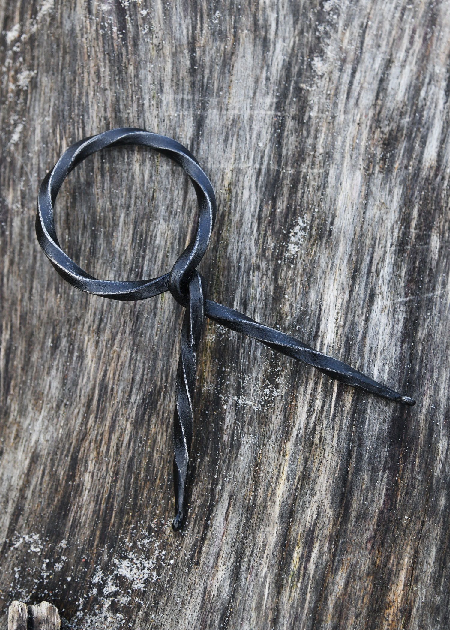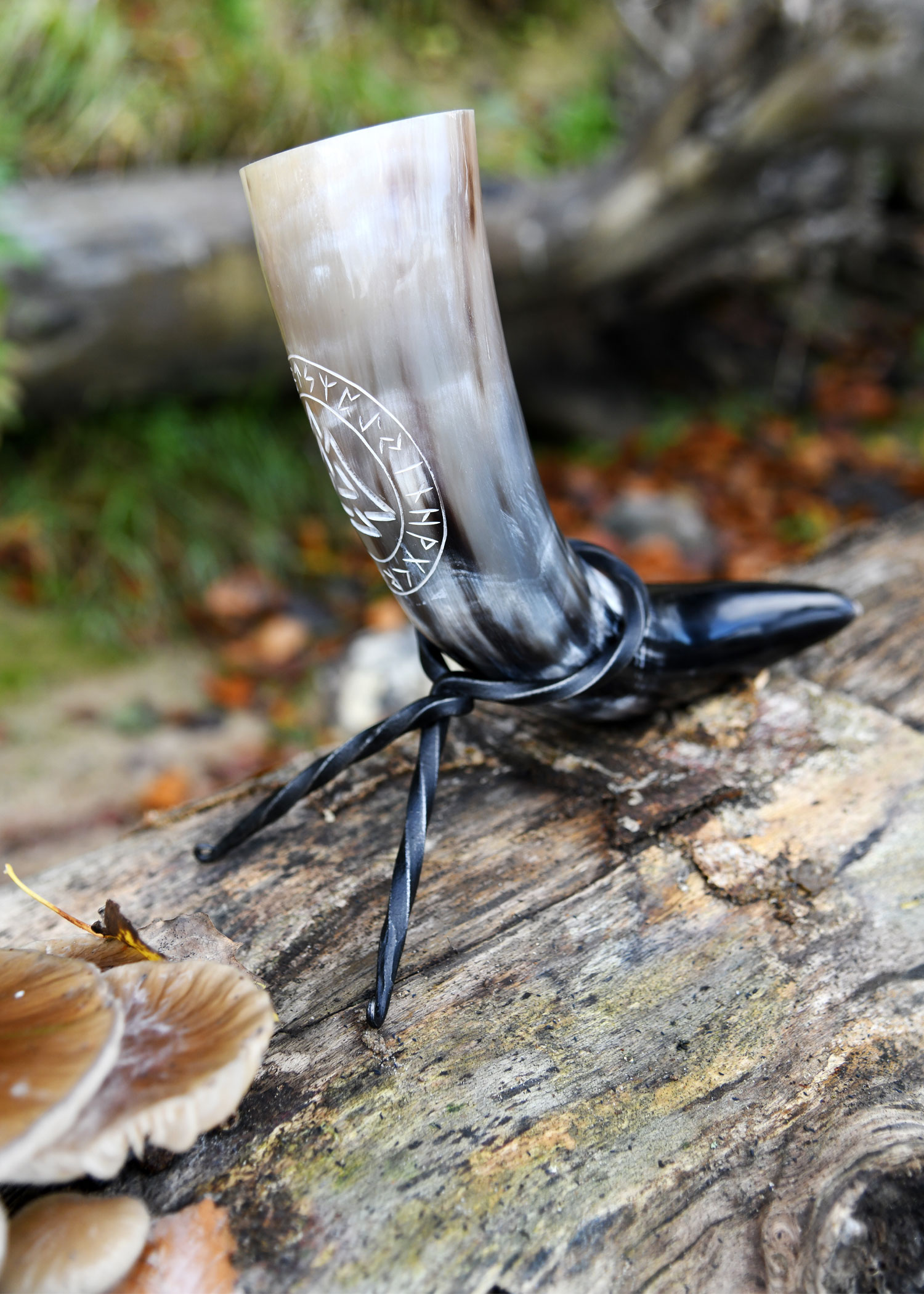 Zum Lieferumfang gehört ein praktischer, gut transportabler Trinkhornständer aus handgeschmiedetem Stahl mit einfachem Prinzip: Steckt man das Horn durch die Öffnung, bilden die Beine des Ständers und die Hornspitze ein standsicheres Dreibein. So kannst Du Dein Trinkhorn immer sicher abstellen.