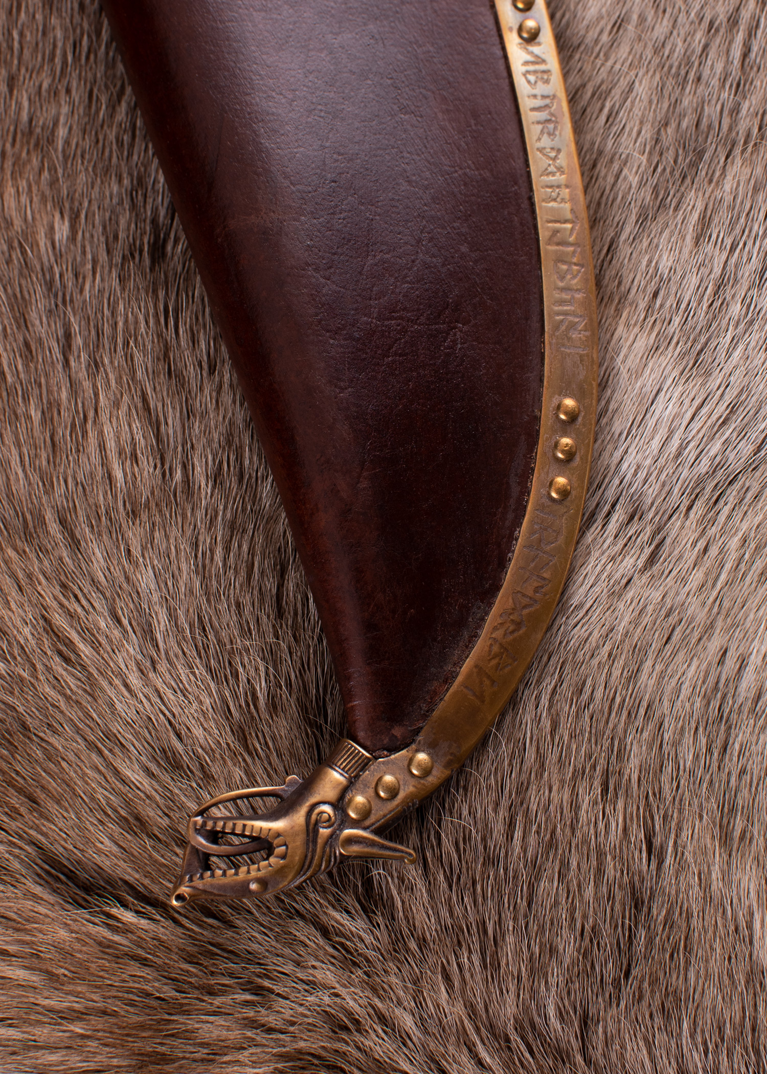 Der Wikinger Langsax kommt samt wunderschöner Scheide aus 3 mm starkem, vegetabil gegerbtem Leder mit Messingbeschlägen (Antik-Finish), inklusive dreier Aufhänge-Ringe. Der untere Metallstreifen, der mit einem Tierkopf (möglicherweise einem Wolfskopf) abschließt, ist angelehnt an einen mittel-angelsächsischen Fund aus dem 8. Jh., der im 19. Jh. aus der Themse in London geborgen wurde und vermutlich Teil des Scheidenbeschlags eines Messers bzw. Saxmessers war. Er weist auch eine Runeninschrift auf, die bis heute nicht zufriedenstellend gedeutet werden konnte. Das Originalstück befindet sich im British Museum (Nr. 1869,0610.1).