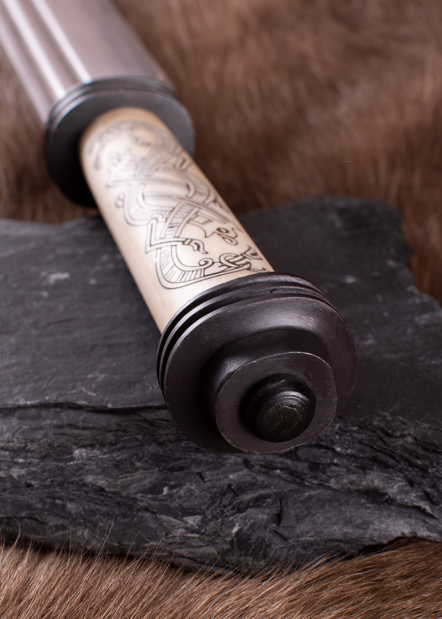 Bitte beachte, dass es sich bei Knochen um ein Naturprodukt handelt und dass Abweichungen in Farbe und/oder Maserung durchaus normal sind. Da das komplett von Hand gefertigt ist, können außerdem die Verzierungen von Exemplar zu Exemplar leicht variieren. Daher ist bei diesem Wikinger- kein Griff wie der andere und die obigen Abbildungen dienen lediglich der beispielhaften Anschauung.