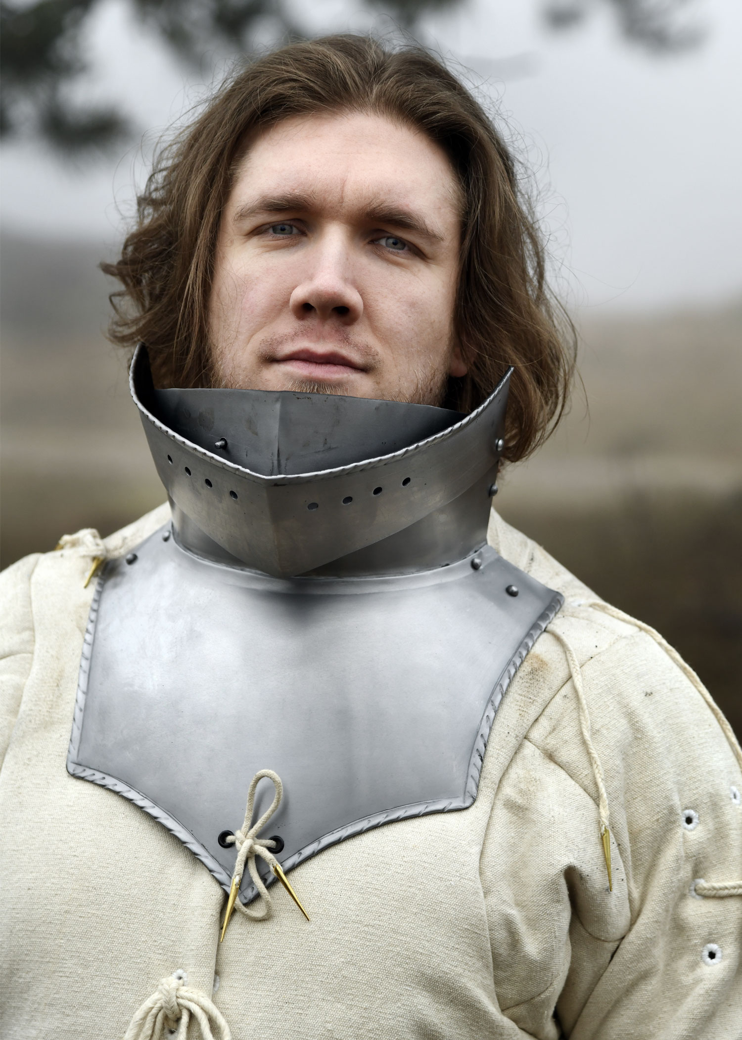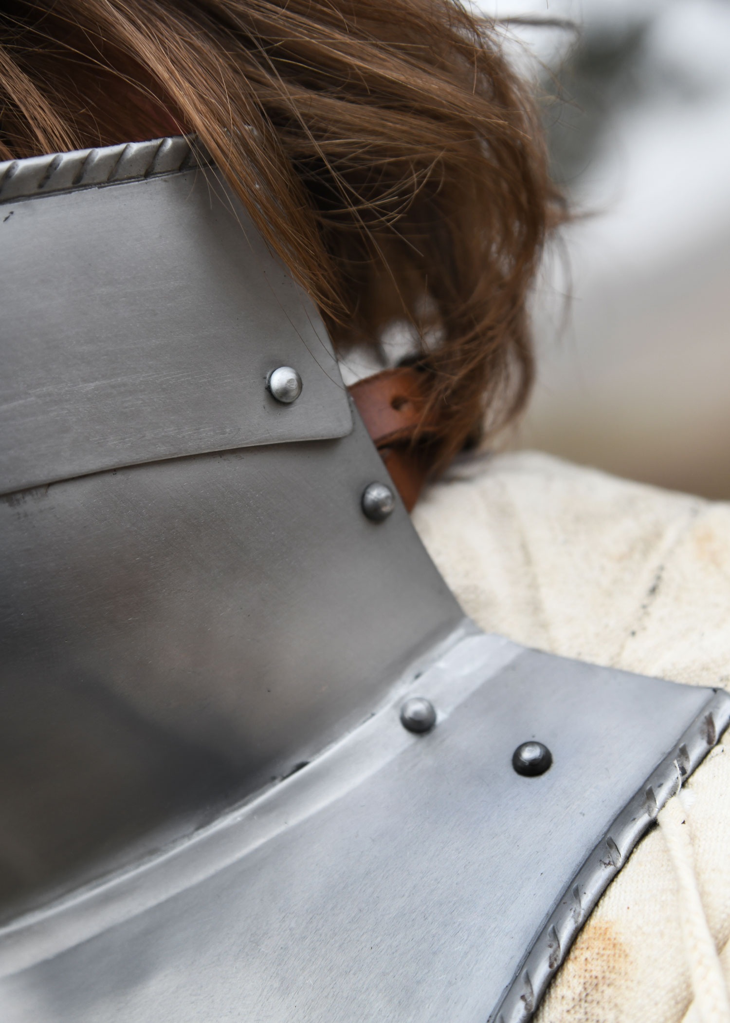 Diese tragbare Nachbildung einer spätmittelalterlichen Halsberge ist aus 1,2 mm Stahl gefertigt und innenseitig zum besseren Schutz vor Korrosion geschwärzt. Die Halsberge, auch Bart oder Kinnreff genannt, weist die für gotische Plattenrüstungen des 15. und 16. Jahrhunderts typische mehrteilige Konstruktion auf. Während Hals- und Kinnschutz fest miteinander vernietet sind, ist die obere Platte über Nieten beweglich befestig und kann hoch- und runtergeklappt werden. In hochgeklappter Position reicht sie bis unter die Augen und bietet so zusätzlichen Schutz für das Gesicht. Ein kleiner, einschiebbarer Stift an der rechten Seite vom Kinnstück fixiert die bewegliche Platte zuverlässig in dieser Position. Die Halsberge ist an der Oberkante verstärkt und mit einer Reihe von runden Aussparungen versehen, die für die nötige Luftzirkulation sorgen. Die Kanten sind umlaufen gebördelt und mit feinen Zierrillen versehen. Mithilfe des an der Unterkante angebrachten Nestelbandes kann die Halsberge einfach am oder Plattenpanzer fixiert werden.