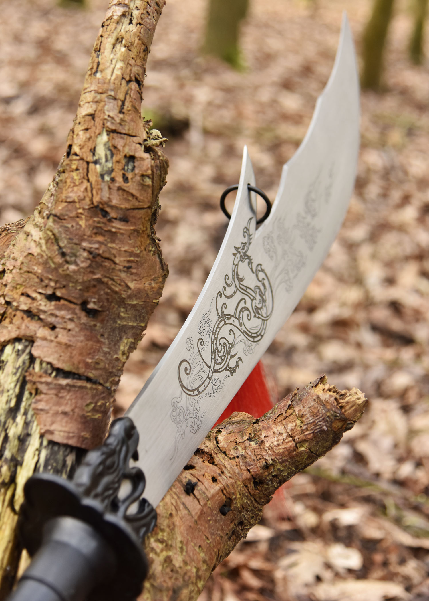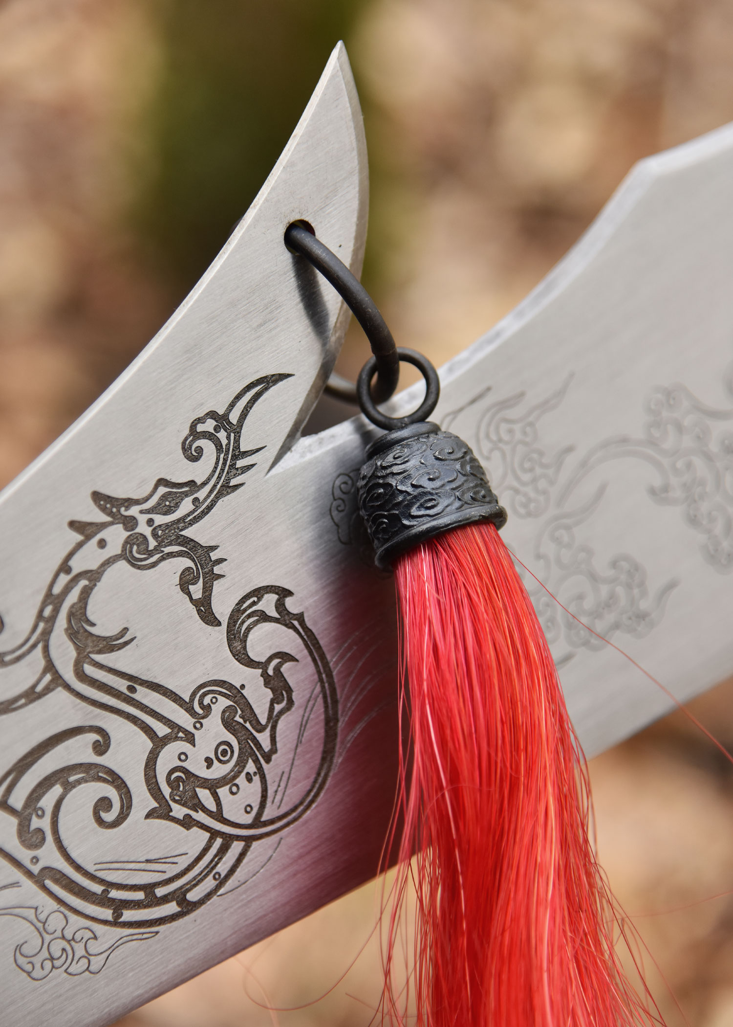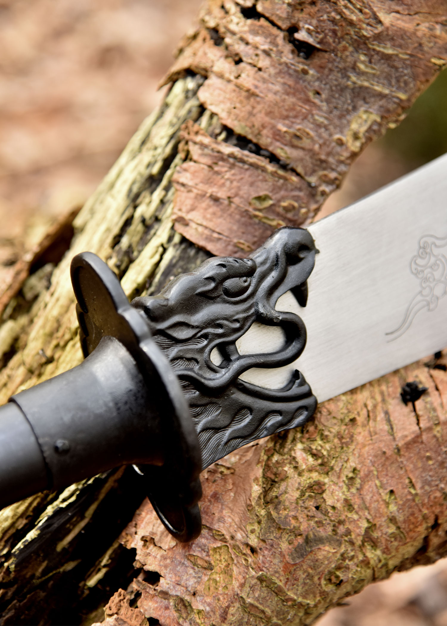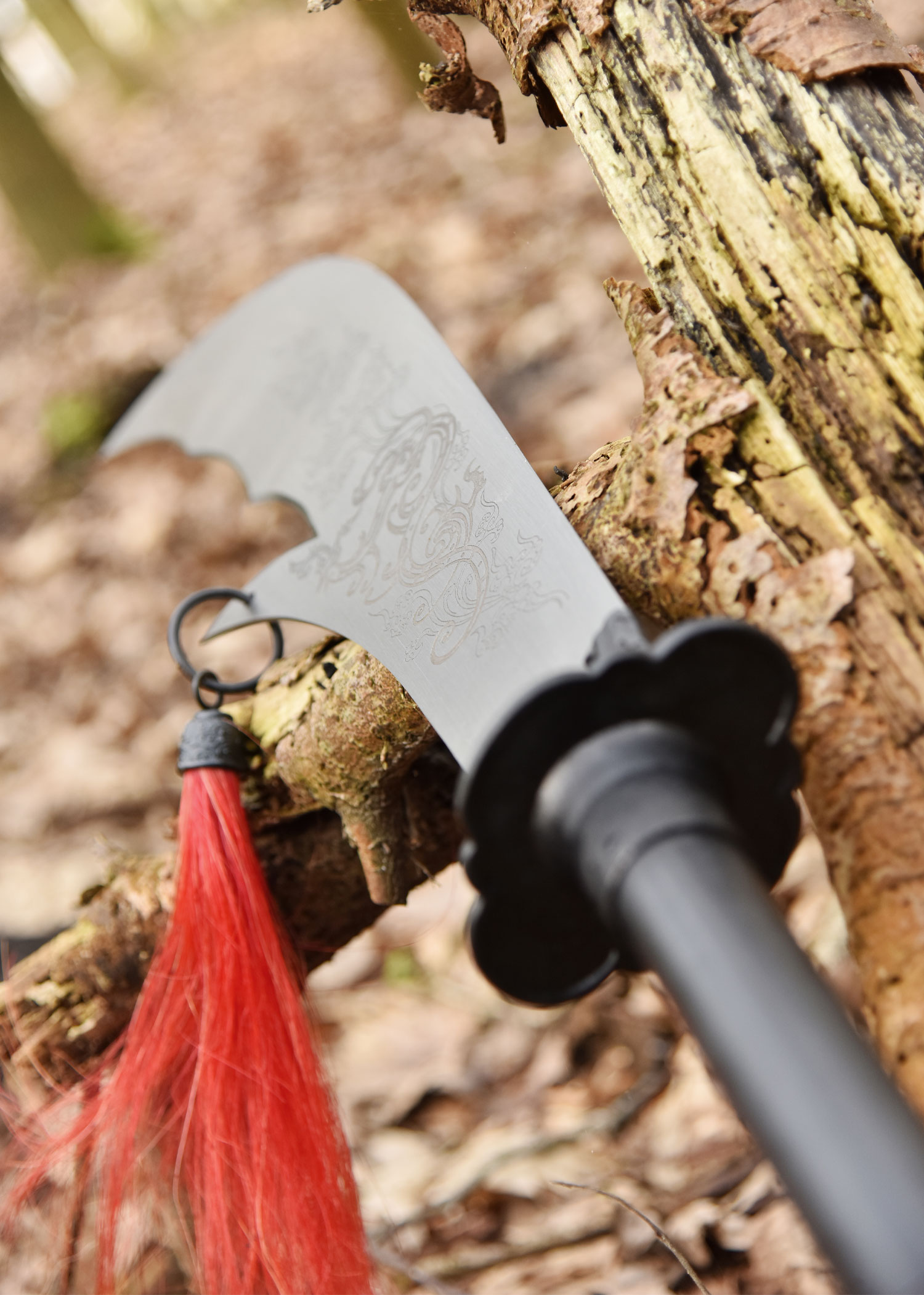 Die Karbonstahlklinge ist für eine bessere Balance distal verjüngt und mit eingravierten Drachenmotiven verziert. Eine traditionelle Quaste ist am Haken der Klinge befestigt. Der Holzschaft endet mit einer Schaftspitze in Vierpassform. Das Parierelement ist antik aufbereitet. Paul Chens Quandao ist leicht, perfekt ausbalanciert und somit ideal für jeden Kampfkünstler, der mit solch einer eindrucksvollen trainieren möchte.