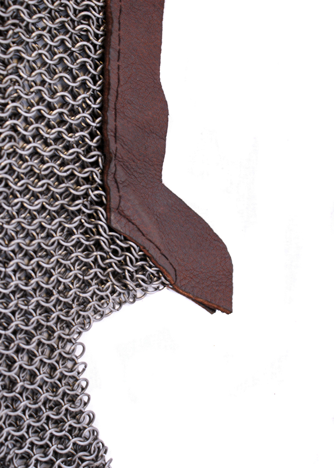 Diese Kettenbrünne von Ulfberth hat einen authentischen, gezackt-geflochtenen Rand und einen angenähten Streifen aus dickem Rindsleder. In diesen Ledersteifen sollten kundeseits die Befestigungslöcher für den Helm eingearbeitet werden. Zur Befestigung an Helmen wie z. B. Hundsgugeln oder Beckenhauben (Bascinet).