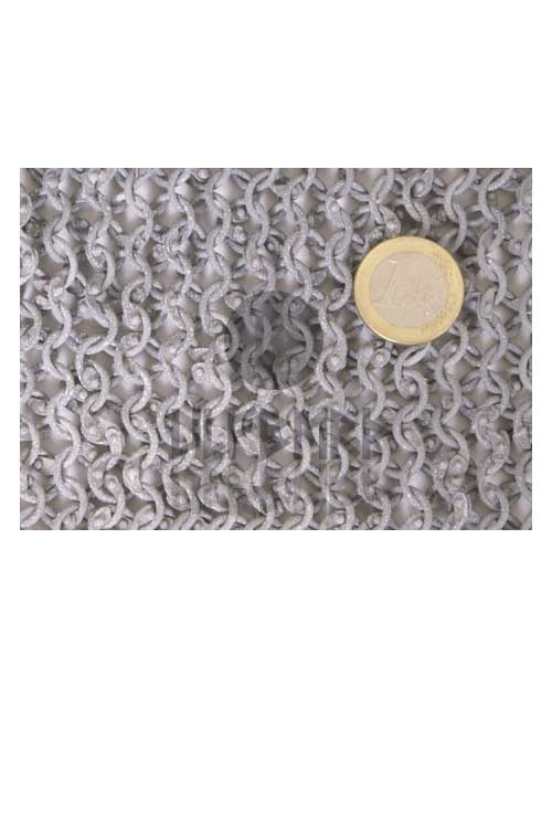 ARR Kettenhemd, Hauberk, Aluminium vernietet, ID 8mm, Gr. L Dieses Kettengeflecht besteht aus runden Ringen mit runden Nietenköpfen, alle Ringe vernietet aus Aluminium. Wir nennen diese Geflechtart ARR nach (Englisch:"Aluminium Round Riveted"). Der Vorteil dieser Geflechtart liegt natürlich im verhältnismäßig geringen Gewicht. Bei diesem hochwertigen und handgeknüpften Kettenhemd handelt es sich um einen sogenannten Hauberk. Das bedeutet, dass es sich um ein langärmliges und knielanges Kettenhemd handelt. Eine solch mächtige Kettenrüstung deckte damit den größten Teil des Körpers ab. Dieser historisch authentische Schnitt wurde oftmals für eine bessere Beinfrei- heit des Trägers durch frontale oder seitliche Schlitze erweitert. Hierdurch können diese langen Kettenhemden sogar von Reitern bequem zu Pferde getragen werden. Unser Hauberk ist grundsätzlich nicht geschlitzt, damit diese bei Bedarf vom Kunden individuell angebracht werden können. Darüber hinaus hat es konisch zulaufende Ärmel, die sich ungefähr alle 5 cm um einen Ring verjüngen. Details für Gr. L: - Brustumfang: ca. 140 cm bei voller Streckung, mit Gambeson sollte der Brustumfang nicht mehr als 125 cm betragen. - Länge: ca. 110 cm - Armlänge: ca. 54 cm - Innendurchmesser: ca. 8 mm - Ringstärke: ca. 1,6 mm - Gewicht: ca. 6,1 kg - Material: Aluminium in grauer Stahloptik (matt)
