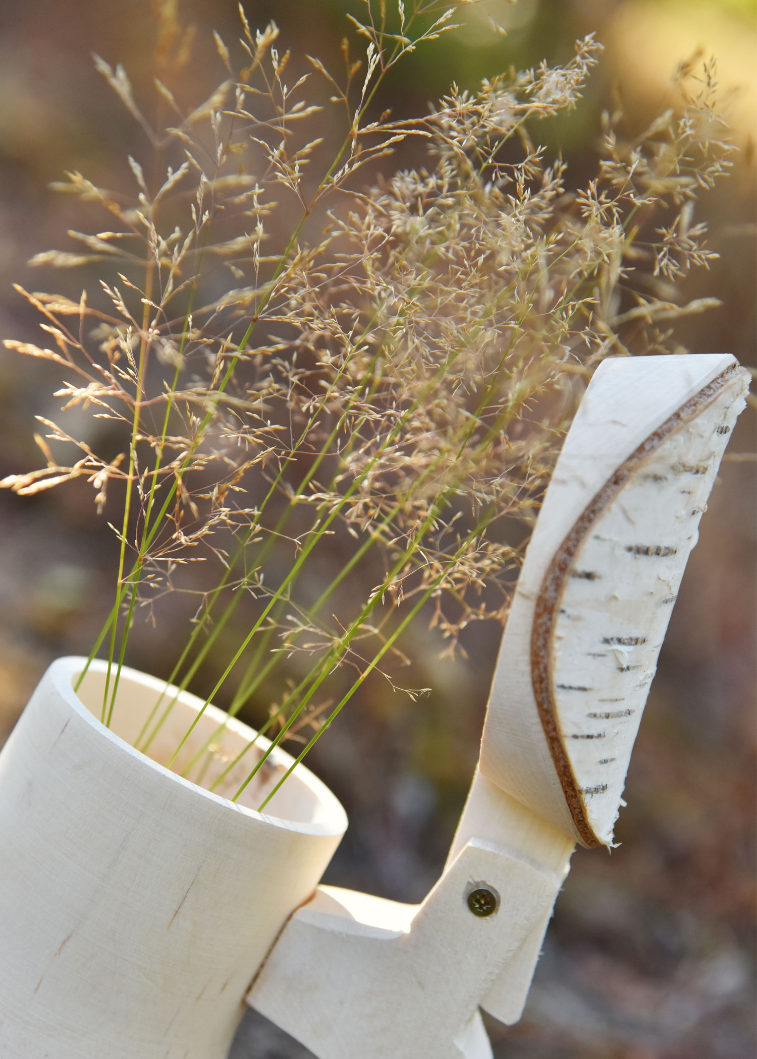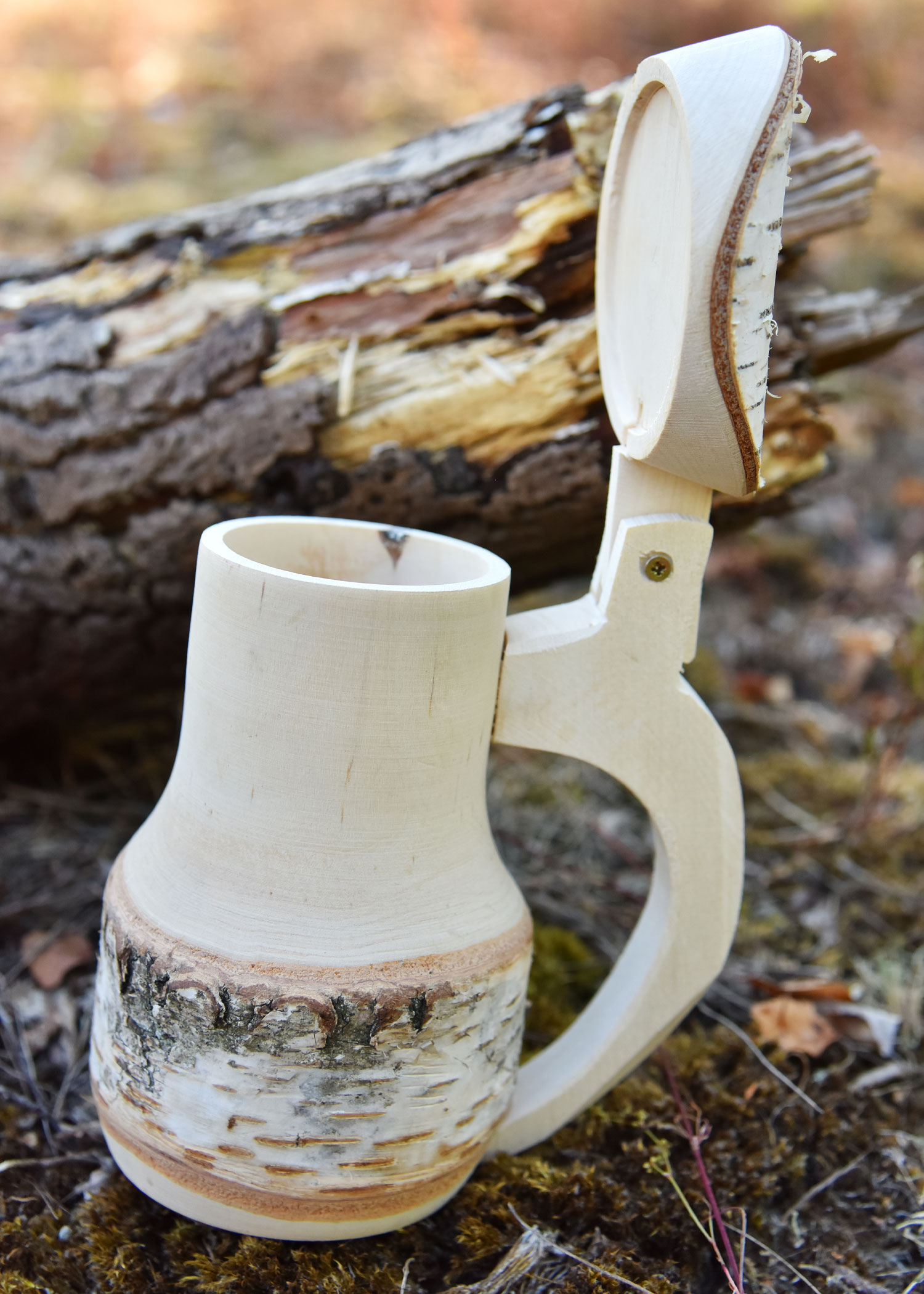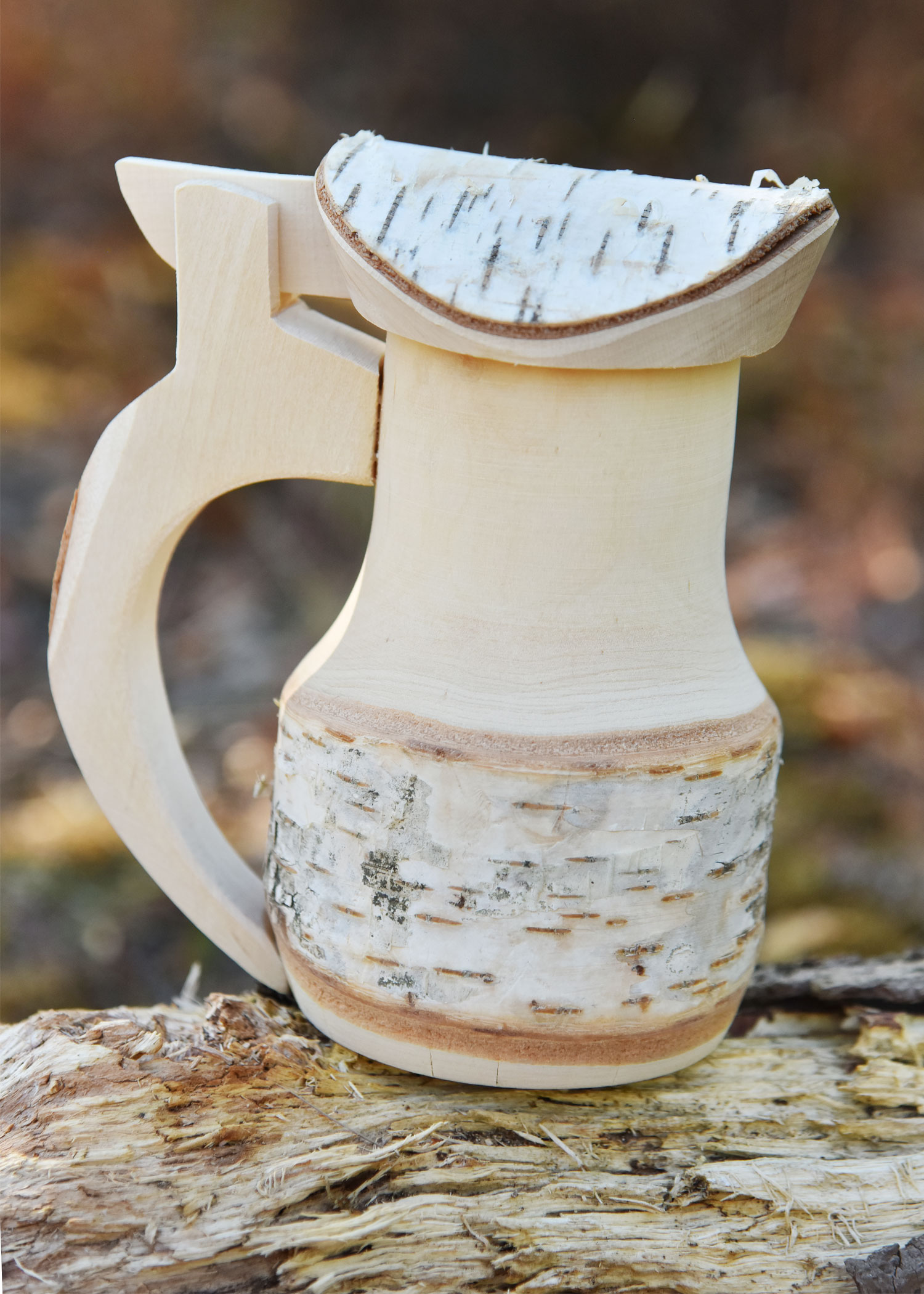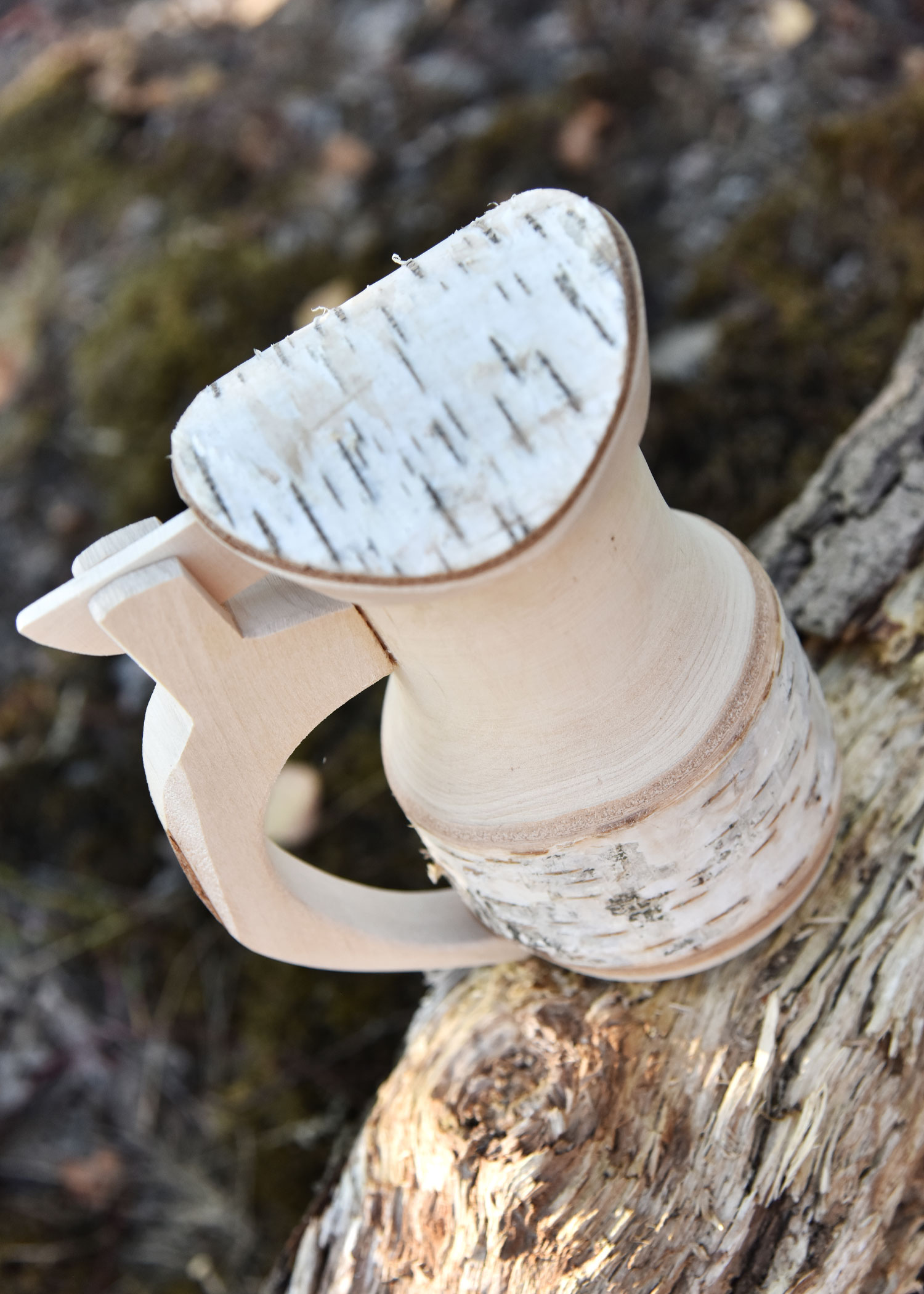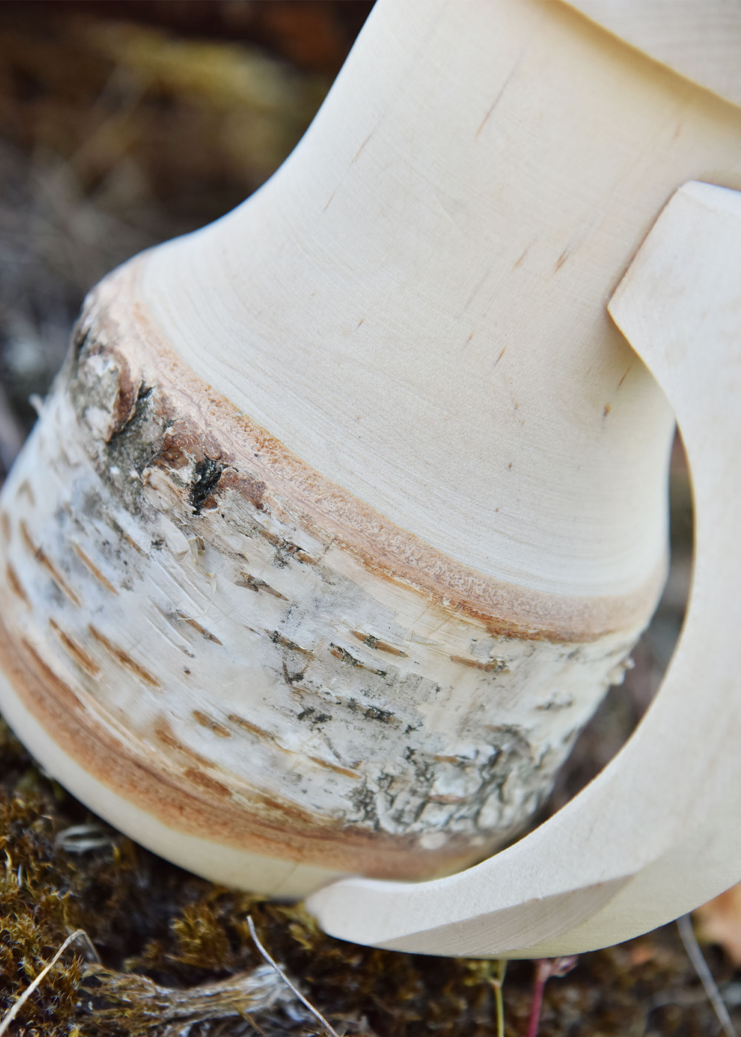 Especially in the Middle Ages, jars were a popular way of storing food or similar items. They came in many different variations. One of them is this jug made of birch wood with a hinged lid. Its handles are glued on and the partially preserved birch bark gives it a quaint look.