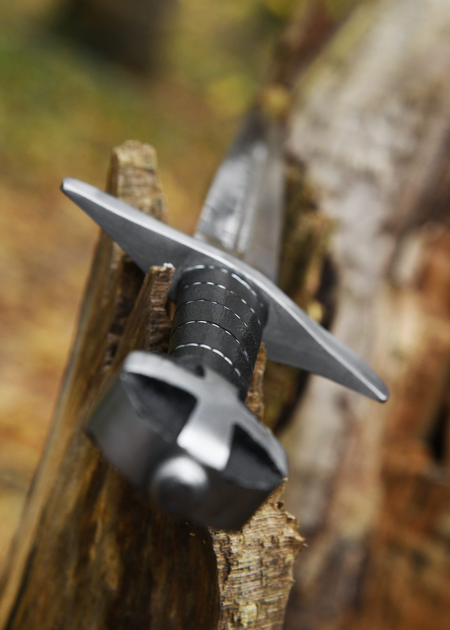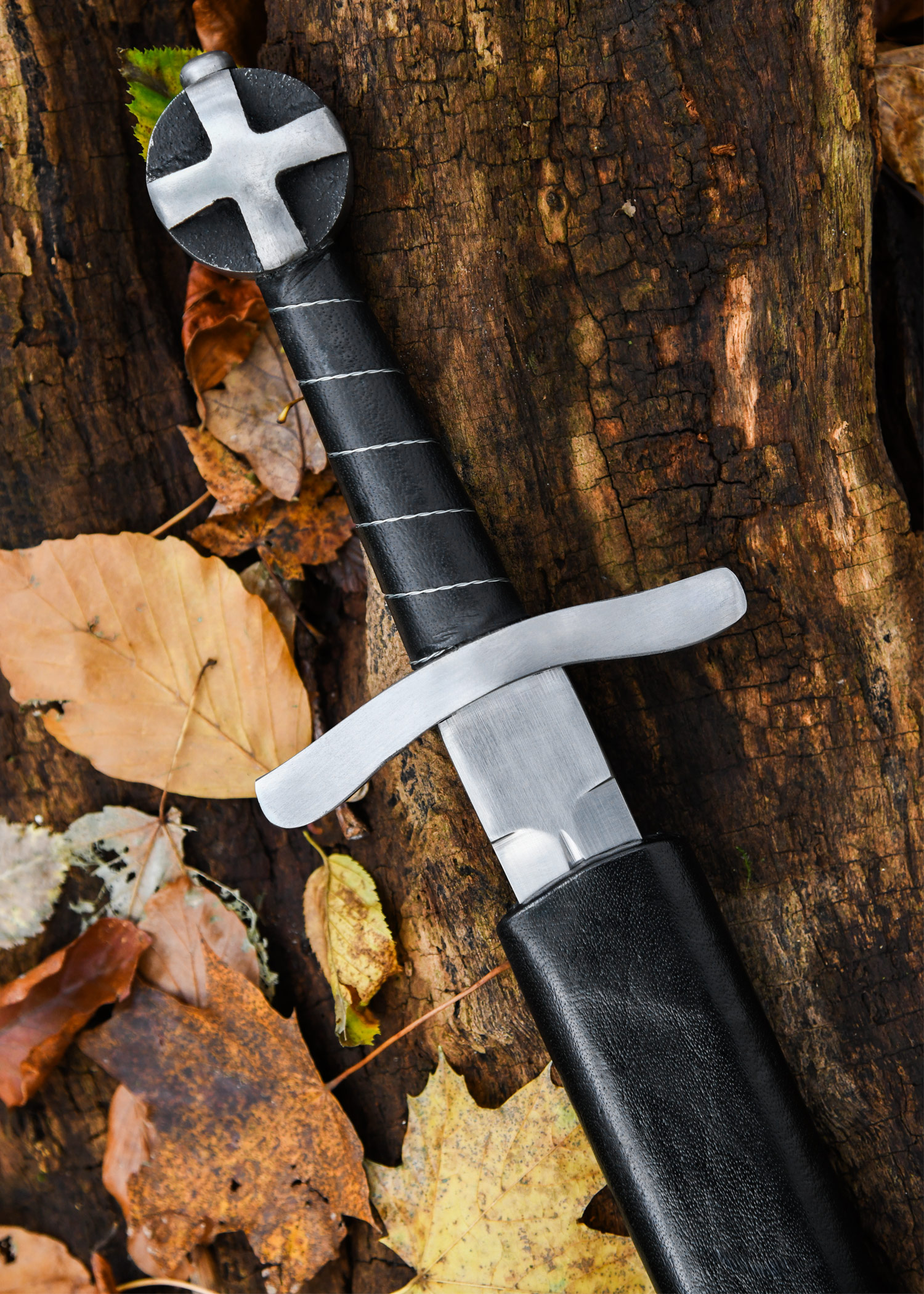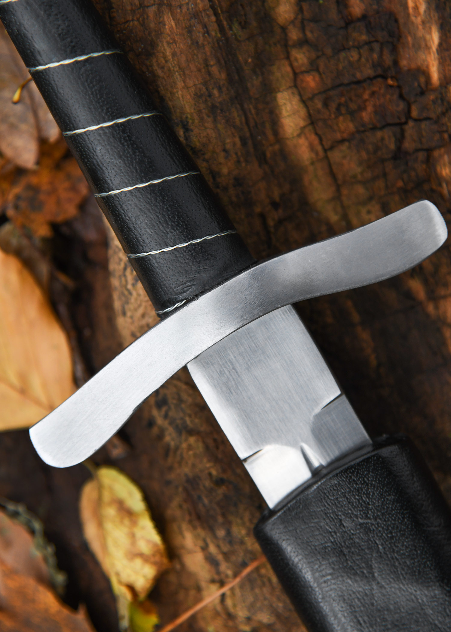 The blade of our replica is forged from spring steel and goes through to the round cast iron pommel, where it is screwed invisibly. The handle is wrapped in leather and braided wire. The dagger also has a solid crossguard. The blade is hardened to approx. 48 HRC in oil. The dagger has a deep, rather long groove. The tip is rounded and it’s edges are unsharpened. The dagger is therefore suitable for light exhibition combat. A matching wooden sheath covered with leather is included.