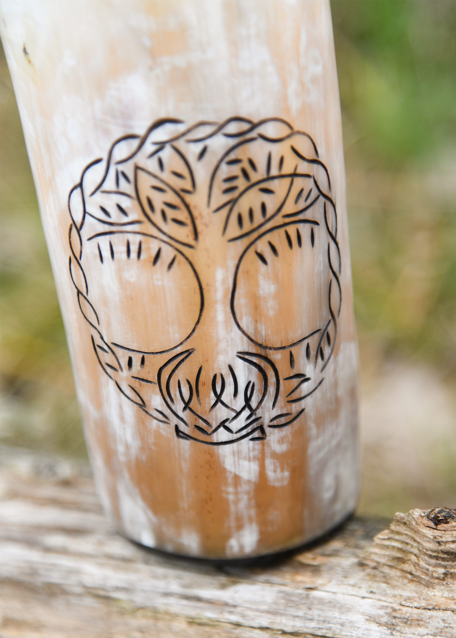 This small cup without handle is hand-crafted from cattle horn, polished, and adorned with an engraved motif of Yggdrasil, the world tree or tree of life.