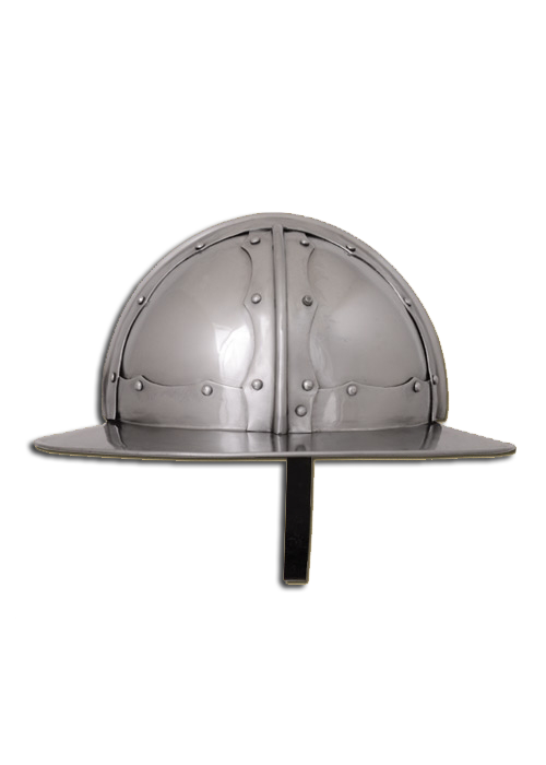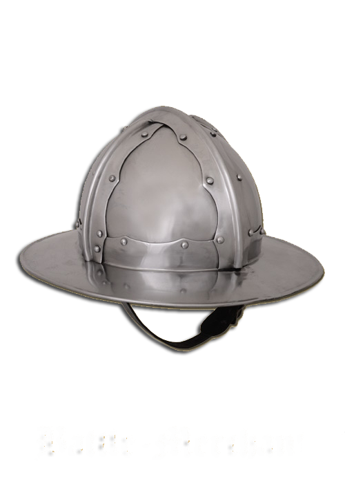 Diese Replik eines italienischen Eisenhutes ist aus 1,6 mm starkem Stahl handgeschmiedet. Das Original wird auf das Jahr 1460 datiert. Diese Helme waren nicht nur in Italien, sondern z.B. auch in der Schweiz und Süddeutschland vorallem bei Fußtruppen sehr verbreitet. Die breite Krempe schütze nicht nur den Kopf, sondern auch Schultern, Brust und Rücken vor Gefahren, die von oben kamen, wie z.B. dem Pfeilhagel der spätmittelalterlichen Bogenschützen. Die Krempe und sich kreuzende, wellenförmige Stahlbänder sind auf die Helmglocke genietet. Diese besteht aus zwei Teilen die mittig verschweißt wurde. Obwohl die Materialstärke "nur" 1,6 mm beträgt ist der Helm aufgrund der Verbeitung durchaus als schaukampftauglich zu bezeichnen. Inklusive eines hochwertigen, gepolsterten Lederinlays und Kinnriemen für perfekten halt. Details: - Größe: für einen Kopfumfang (Hutgröße) bis ca. 61 cm geeignet Langer Innenabstand (Hinterkopf-Stirn): ca. 21,5 cm Kurzer Innenabstand (Ohr-Ohr): ca. 17,5 cm - Material: ca. 1,6 mm Stahl - Inlet mit Kinnriemen aus Rindsleder - Gewicht: ca. 3,0 kg