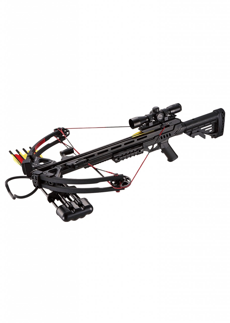 With a speed of 370 FPS, this crossbow is one of the most powerful models. A great advantage of this MK-XB52BK is that its gun stock is adjustable in 6 positions. The position of the front grip is also adjustable in several steps. Moreover, it is equipped with Picatinny rails on the top and bottom. You can mount the sight (which is included) on the top rail. The lower rail is suitable for a bipod, light or laser. Due to its high speed, this crossbow is equipped with string dampers. For safety reasons, it is especially suitable for experienced shooters.