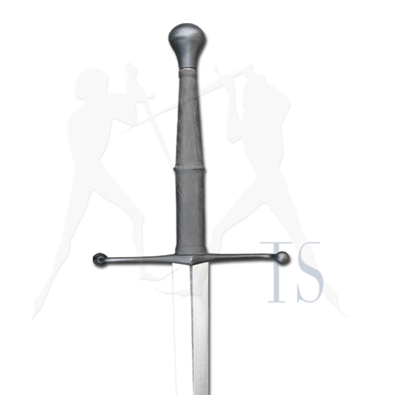 Langschwert Typ XXIII Wallace Kreuz in "S"-Form Griff, Kreuz, Knauf in schwarz Griff: Leder Länge gesamt: 133 cm Klingenlänge: 102 cm Griff: 30 cm Kreuz: 23 cm Klingenbreite am Kreuz: 4,45 cm POB: 9,5 cm vor dem Kreuz Gewicht: 1750 g Stumpfe Version