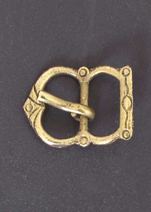 Nachbildung einer spätmittelalterlichen Schnalle wie sie an Gürteln, Taschen und Riemen befestigt wurde. Für eine Riemenbreite von bis zu 21 mm geeignet. Details: Material: Messing Riemenbreite: bis ca. 21 mm