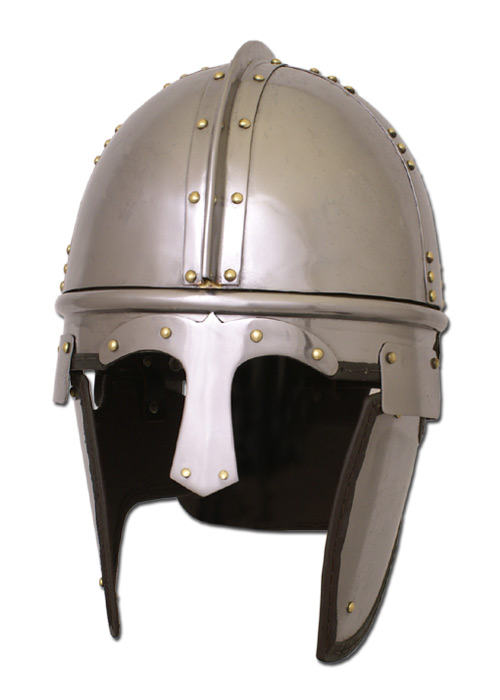 Solide Nachbildung eines spätrömischen Helmes, welcher im ehemaligen römischen Castell Gariannonum, heute Burgh Castle Norfolk, England im Jahre 1960 gefunden wurde. Es handelt sich um einen Helm der römischer Infanterie, die sich im dritten Jahrhundert in diesem Gebiet bereits mit den eindringenden Sachsen herumschlug. Ein sehr typischen Helm dieser Übergangszeit zwischen Spätantike und Früh- mittelalter. Der Helm besteht aus vier Segmenten, welche durch Spange und Kamm mit einander verbunden sind. Er hat bewegliche, innen und am Rand mit Leder ausgekleidetet Wangen- und Nackenklappen und besitzt ein kurzes angenietetes Nasal. Wie sein Original, gefertig in Handarbeit und vernietet mit Messingnieten. Der Helm hat ein komfortables Lederinlay. Die Wangenklappen können mittels Lederband passend zu geschnürt werden. Details: Material: ca. 1,5mm Stahl, Rindsleder Größe: für Kopfumfang bis ca. 62 cm geeignet. Maße innen: - von vorn nach hinten: ca. 22,5 cm - von Ohr zu Ohr: ca. 19,7 cm Gewicht: ca. 2,05 kg