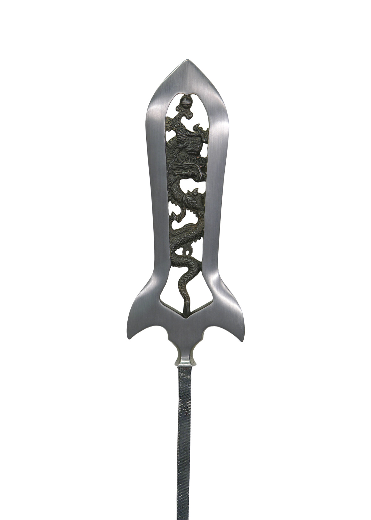 The Japanese arrowheads called Yajiri or Yanone had many uses and shapes. Some were strictly utilitarian while others were beautifully pierced and decorated and used primarily for presentations and temple offerings. It is said that a samurai had a quiver of 26 arrows (Ya) and one of them, called the Kabura-Ya or Whistling Arrow, was only used if the battle was lost. Most pieces fall into one of several broad groupings. The Swimming Dragon offered here falls into the barbed pattern. These shapes are usually very ornamental in form but can be terribly efficient. These arrowheads can vary in length from 2.5 cm to 16 cm and most of them have saw-cut areas. These arrowheads, either singly or in groups, are outstanding collectibles and are sure to be much talked about items in your collection.