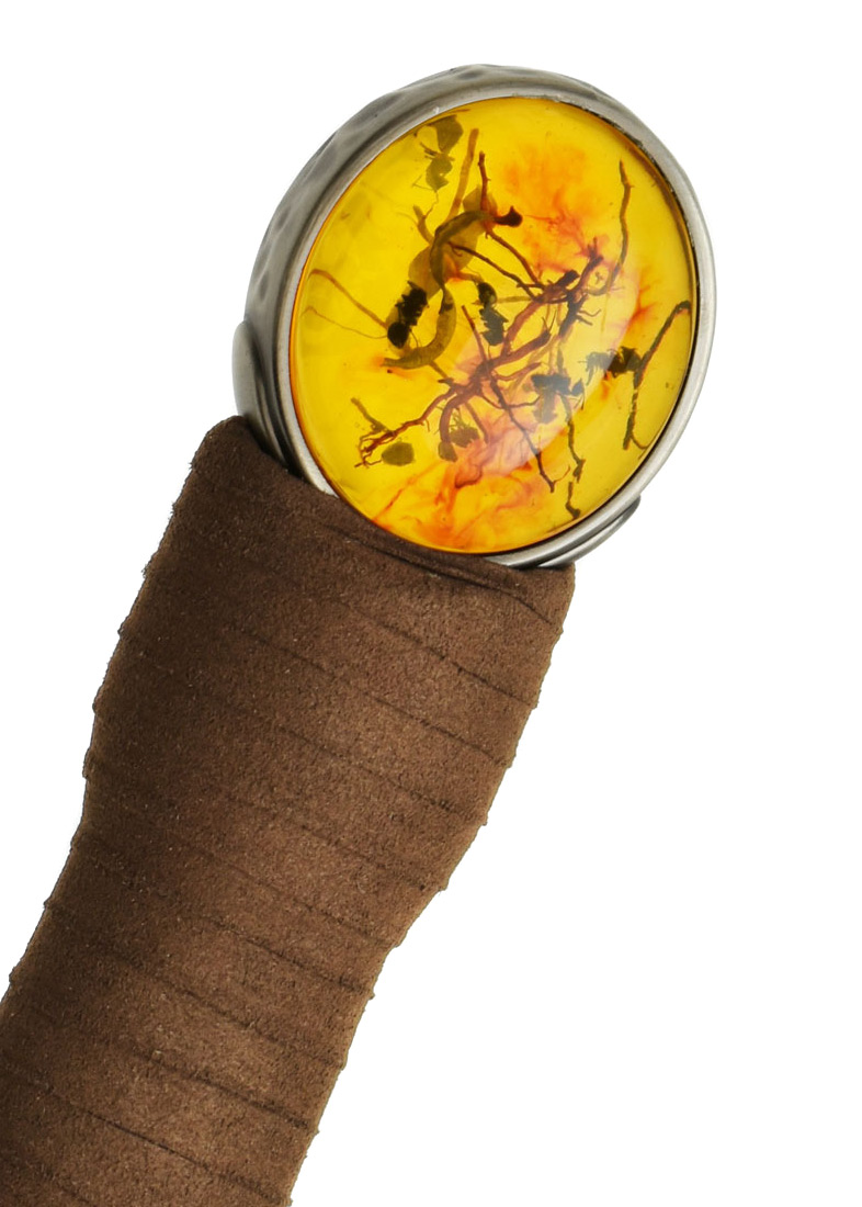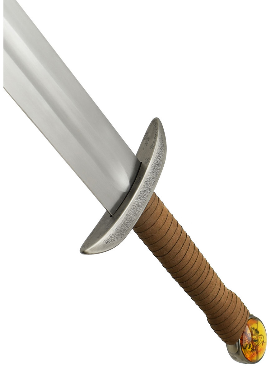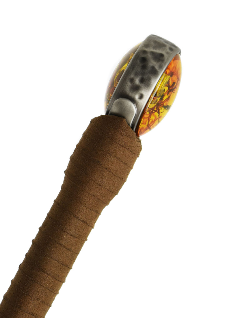 - Handle material: leather wrap, cast metal, faux amber pommel
